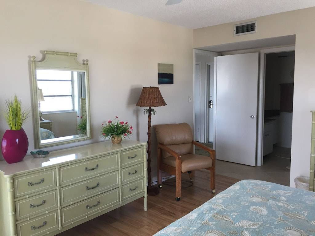 The unit has two separate, private bedrooms, each with their own en suite, updated bathroom, flat-screen cable TV, ceiling fan, hair dryers, free wifi, and Gulf view with sliding glass doors to the lanai. The master has a king bed and the guest bedroom has two twin beds.
