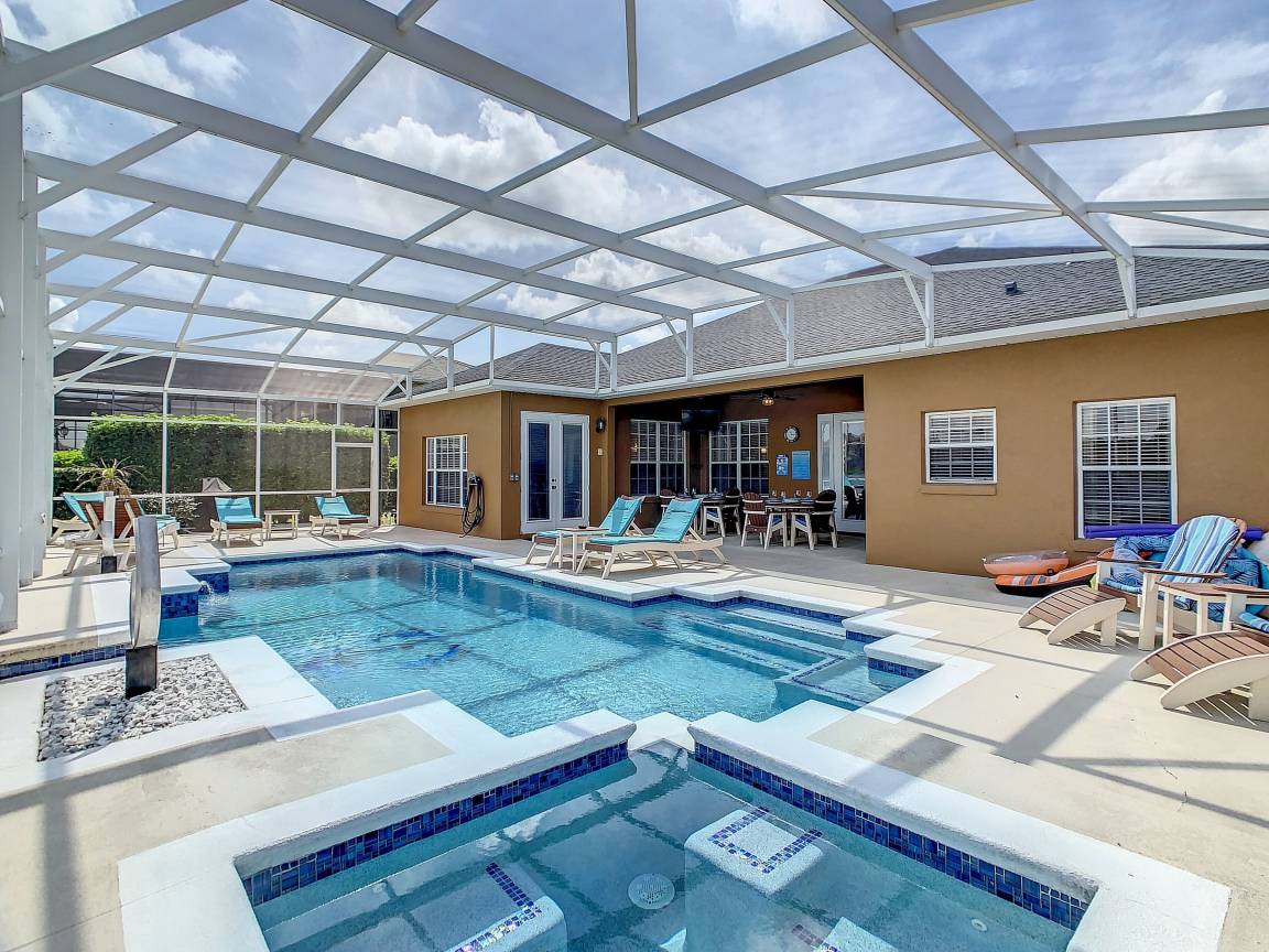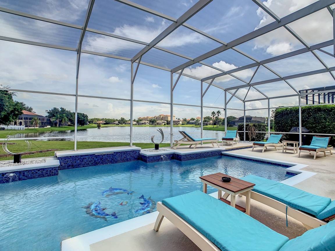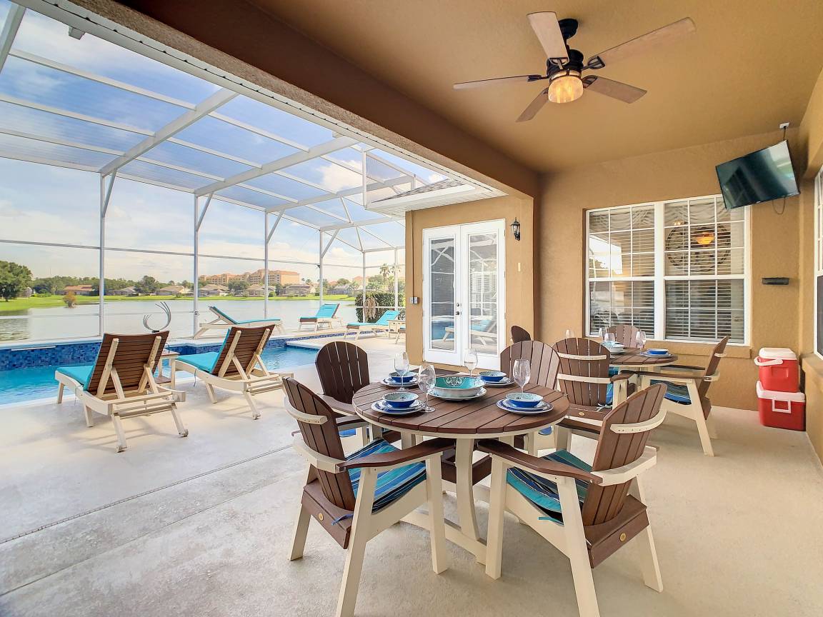 The pool and spa are gas heated for an additional charge, and all doors leading to the pool area are protected with an alarm, to help make sure little ones can’t get outside without you knowing. The pool deck comes equipped with plenty of seating, lounge chairs, and tables for everyone to use, so you can enjoy and relax on your vacation. There is also a covered lanai area with cable tv, so you can enjoy the view of the pool and lake in the shade.