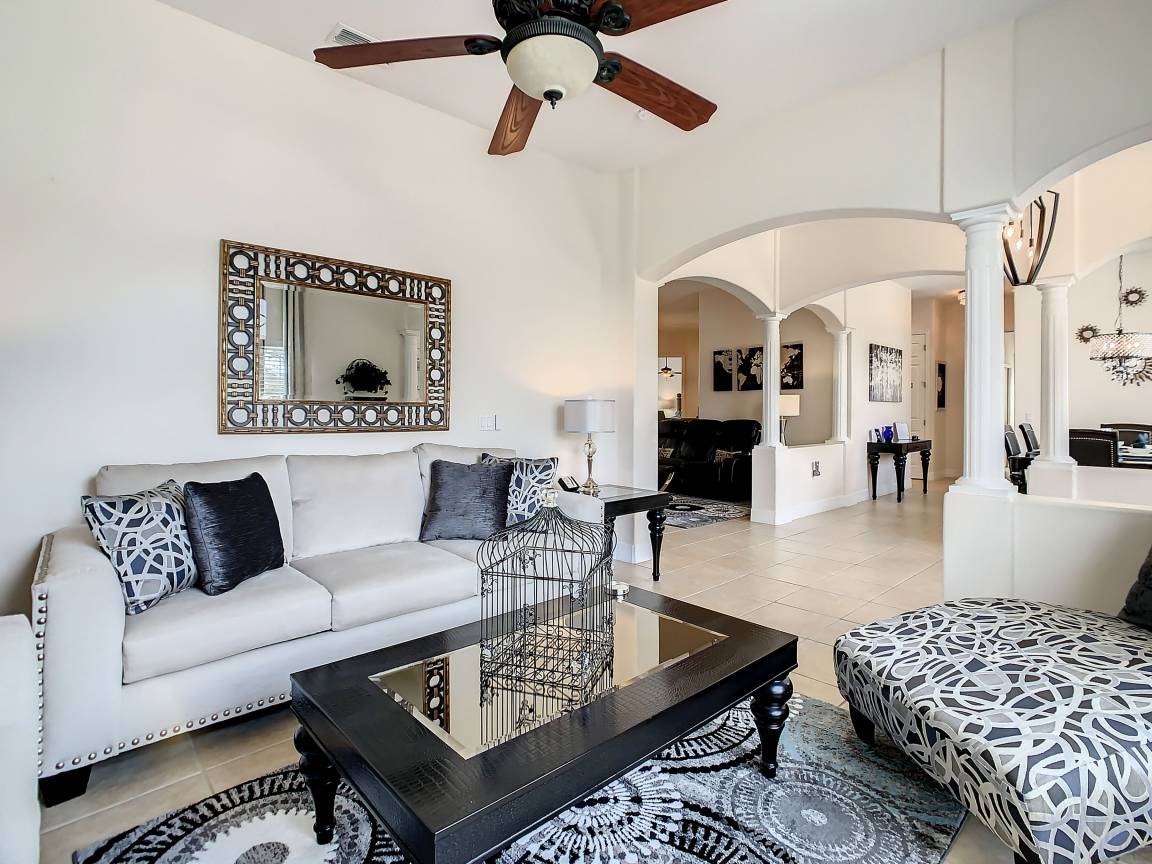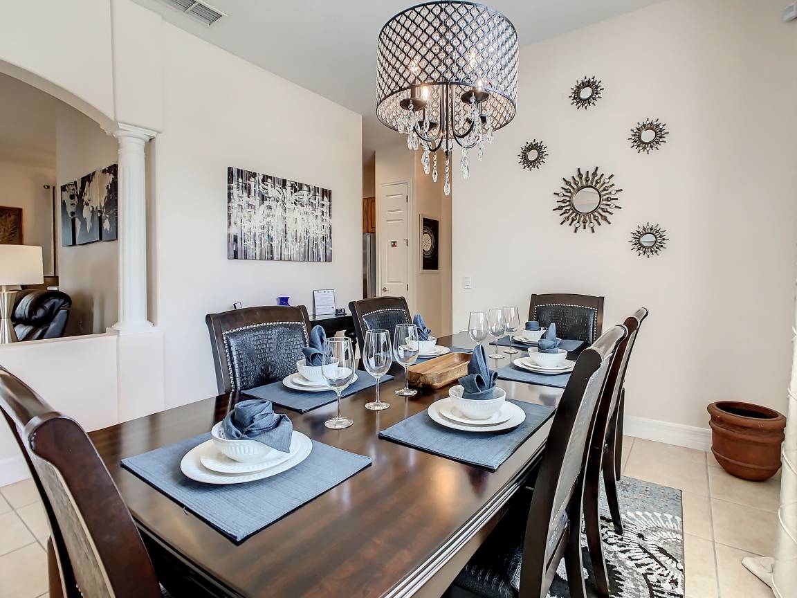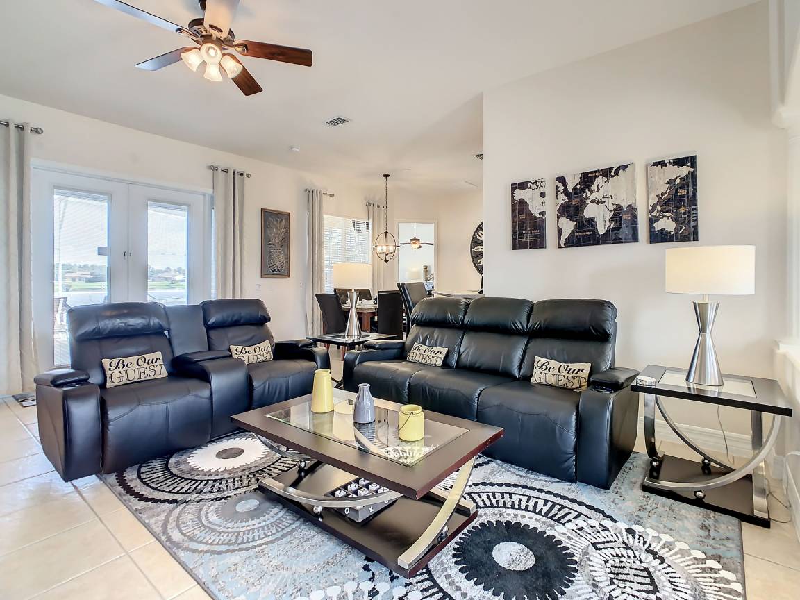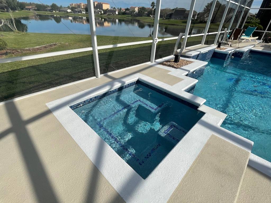 The pool and spa are gas heated for an additional charge, and all doors leading to the pool area are protected with an alarm, to help make sure little ones can’t get outside without you knowing. The pool deck comes equipped with plenty of seating, lounge chairs, and tables for everyone to use, so you can enjoy and relax on your vacation. There is also a covered lanai area with cable tv, so you can enjoy the view of the pool and lake in the shade.