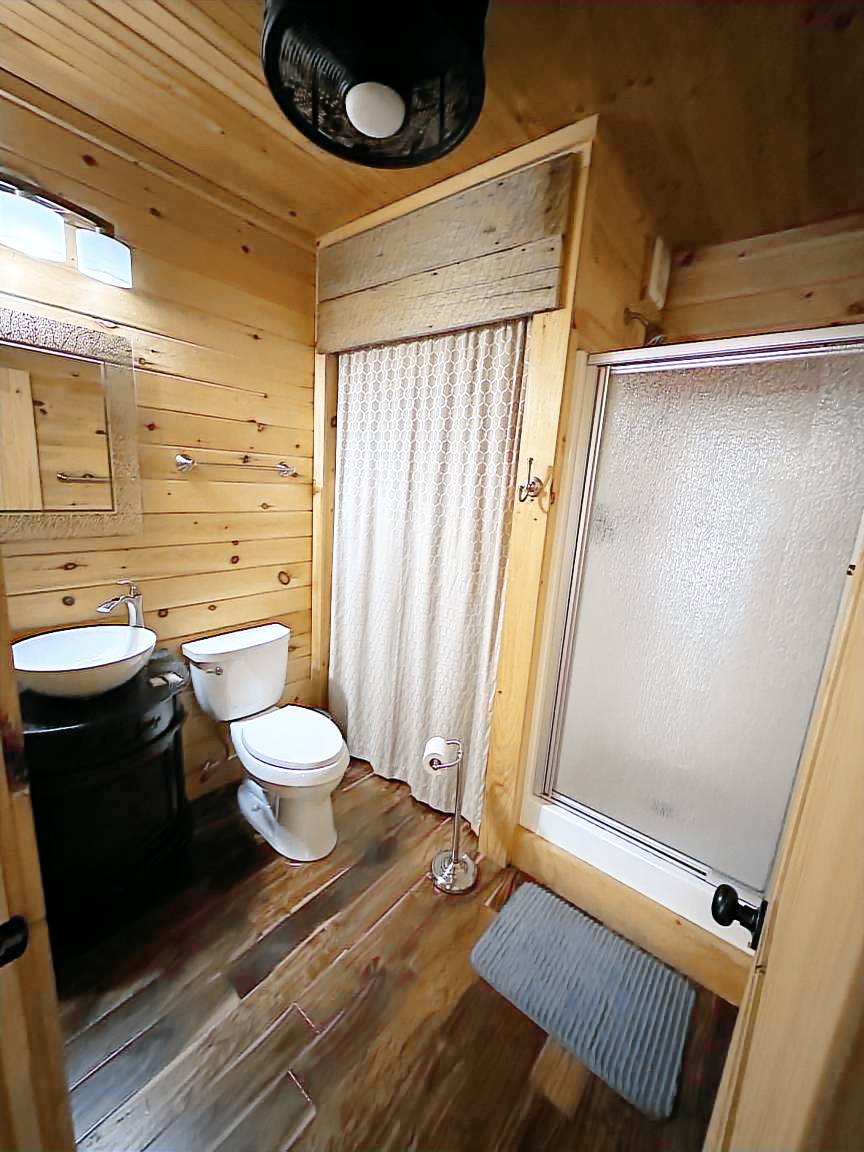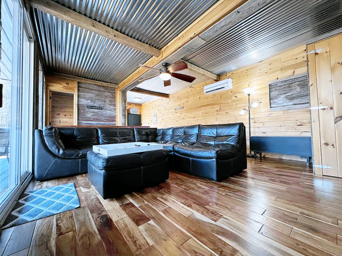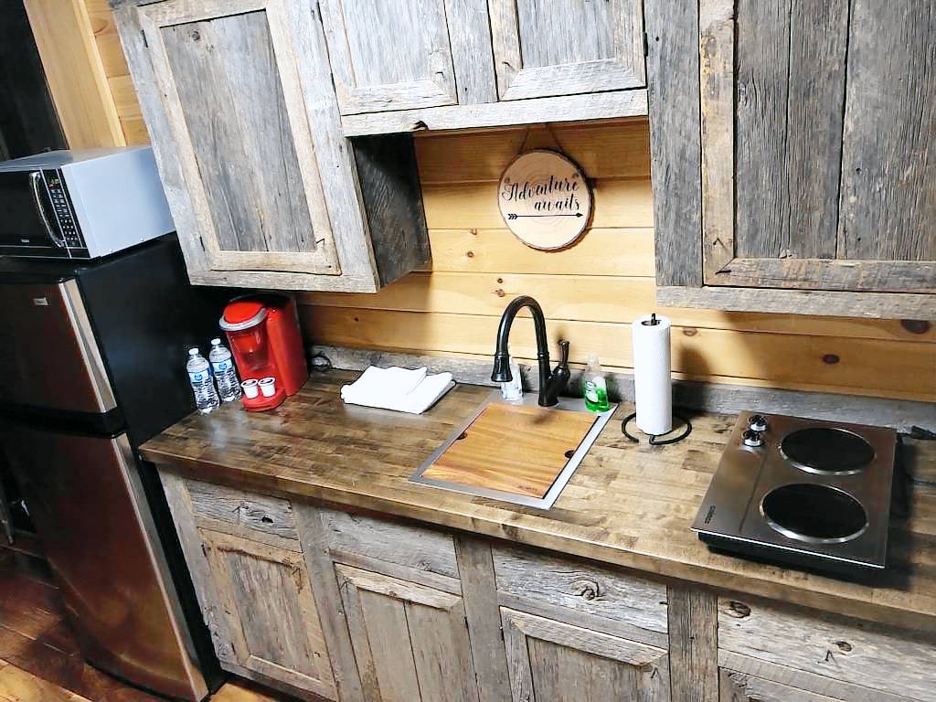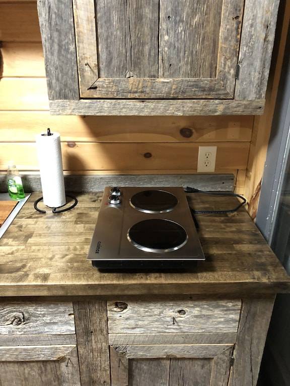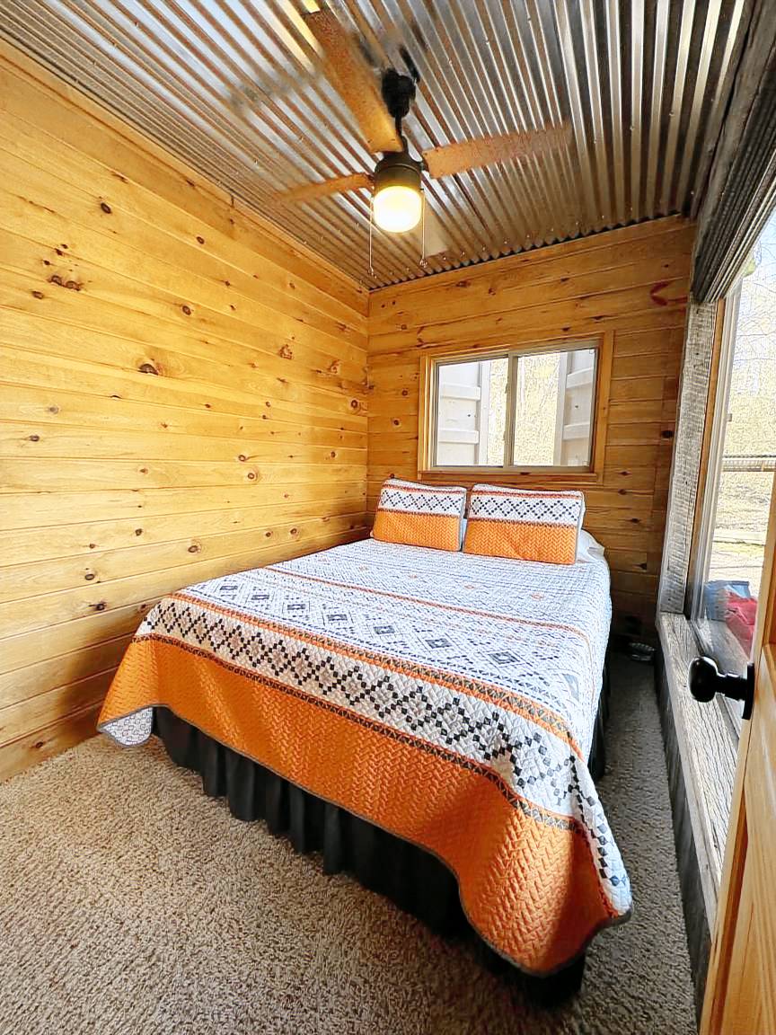 The cabin features two bedrooms with queen beds and one full bathroom with a walk in shower. The living room has a large leather sectional couch with ottoman, 42” television, DishNetwork, DVD player and WIFI. The kitchen includes a refrigerator/freezer, microwave, toaster, two-burner hot plate, sink, and all dishes and cooking utensils. (No stove) The cabin is climate controlled (Air Conditioning and Heat) and has city water. The outside of the cabin features a large covered deck with chairs, a firepit, and gas grill. Go explore in the surrounding woods!