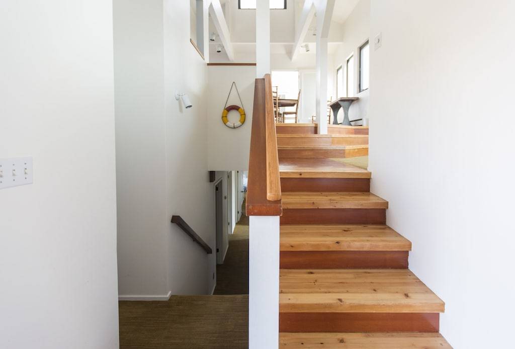 All four bedrooms and two full baths are on the lower floor. A shower bathroom is at the entry level. H67 has several different levels and a number of stairwells. There are staircases inside at each end of the house allowing for an easy flow when you host a full house.