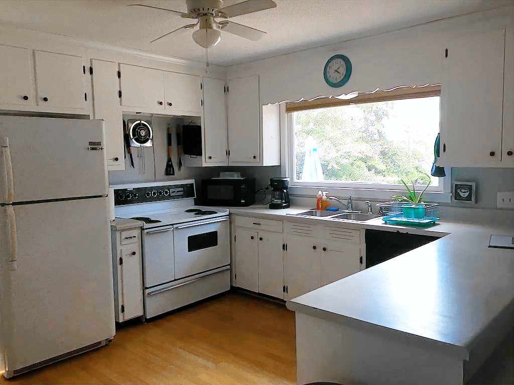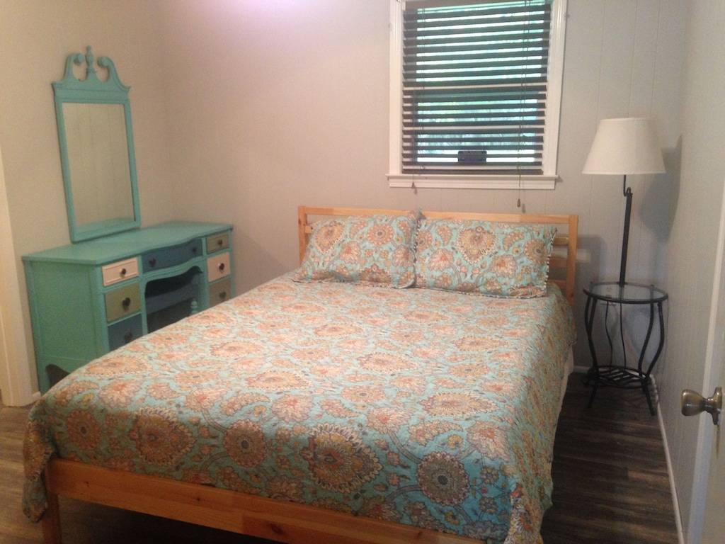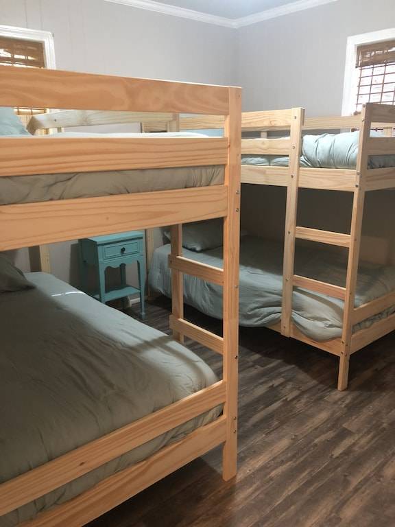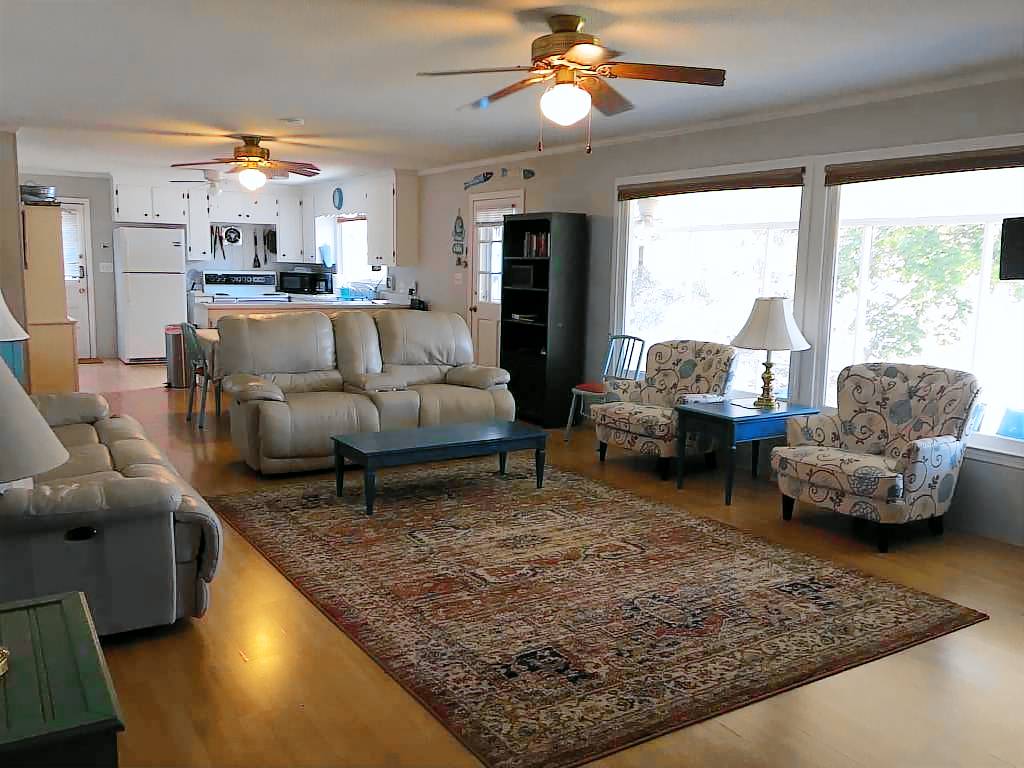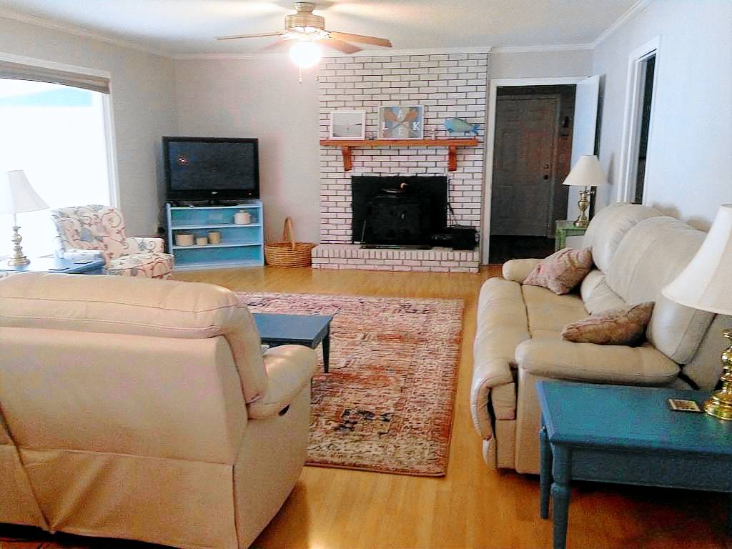 This house features 3 bedrooms and 2 full bathrooms. The master bedroom has queen bed with private bathroom with shower. The middle bedroom has queen bed. The bunk room has 2 sets of 2 bunk beds (sleeps 4). Bathroom with tub/shower combo is between the bedrooms. The den has a comfy leather couch & love seat with 4 electric recliners, and two arm chairs. The kitchen table seats 6 and there are also 5 bar stools at the bar. There is a table with 6 chairs on the screened porch plus a small table with 4 chairs.