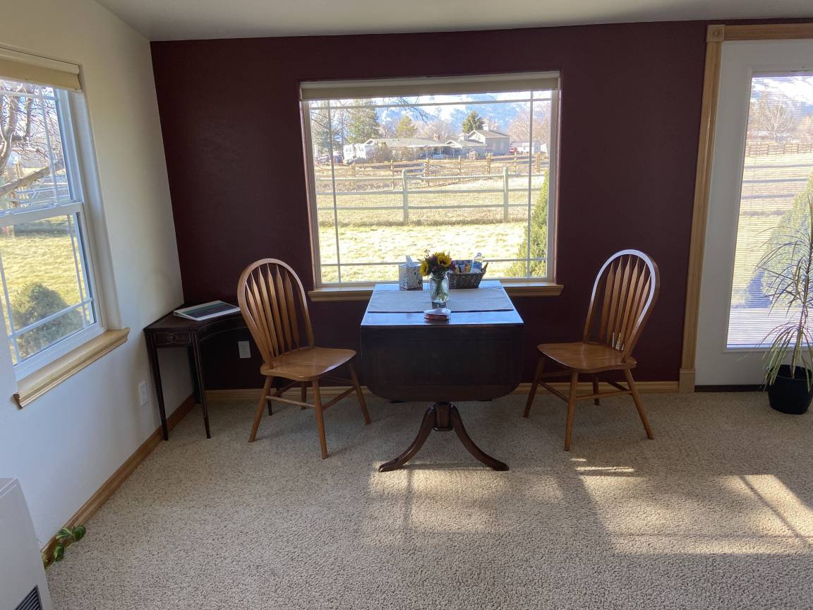 The guest house features a spacious living room, big picture windows with views of the mountains, dining table, kitchenette, one bedroom with queen size bed, and a bathroom with toilet, sink, and standup shower. Room enough for one couple, and option of more (which includes children) with two provided cots upon request. Wifi, cable TV, and A/C are also included. Guests are welcome to enjoy their evenings around the fire pit, or just sit back and enjoy conversations on the deck while taking in the beauty of the Bitterroot Mountains. A shared patio with bbq grill is also available. Washer and Dryer on the property are available upon request at no extra cost.