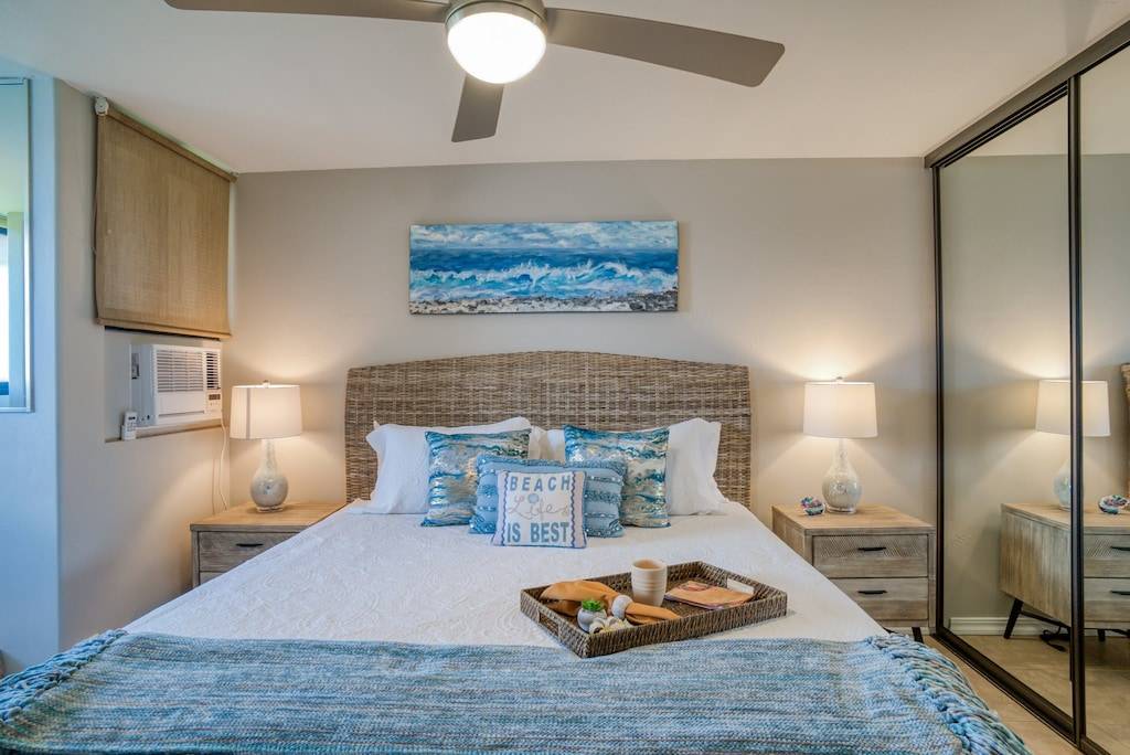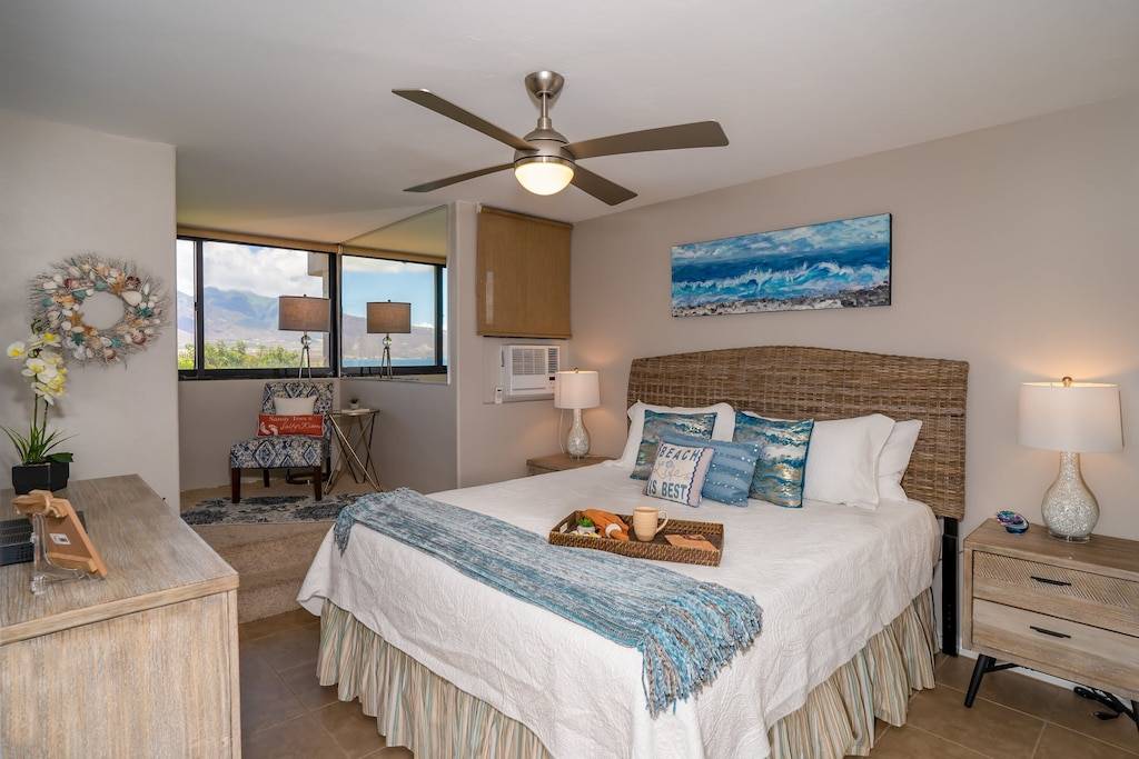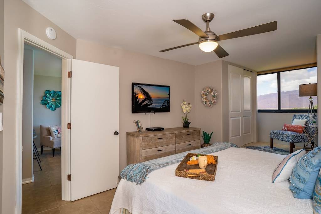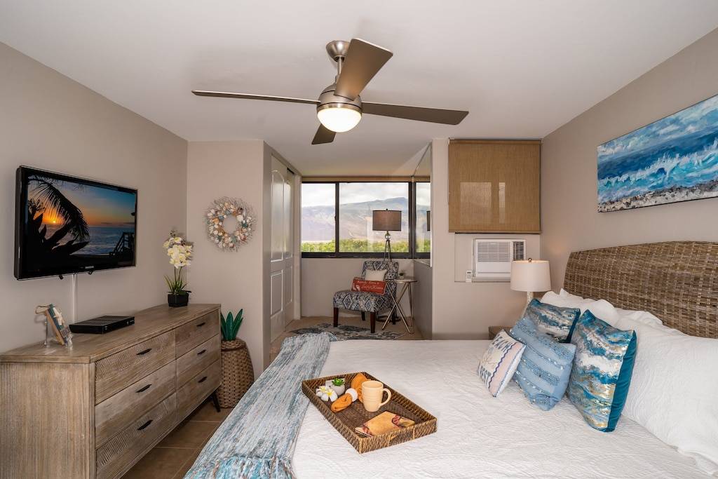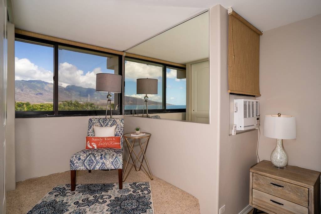 This 1 bedroom condo is bright and open. The bedroom has a king size bed, full-sized dresser, ample closet space, a flat screen TV and a sitting nook with amazing ocean and mountain views. This is new rental unit, hence why this unit does not have reviews yet. I have a studio rental in this same resort with glowing 5 star experience ratings (please see VRBO#91648). I hold both units to the same design, maintenance and hospitality standard, so you can book this unit with confidence.