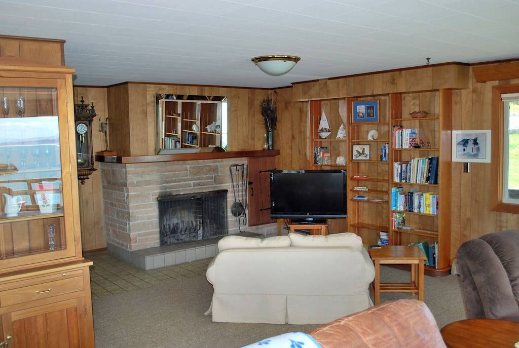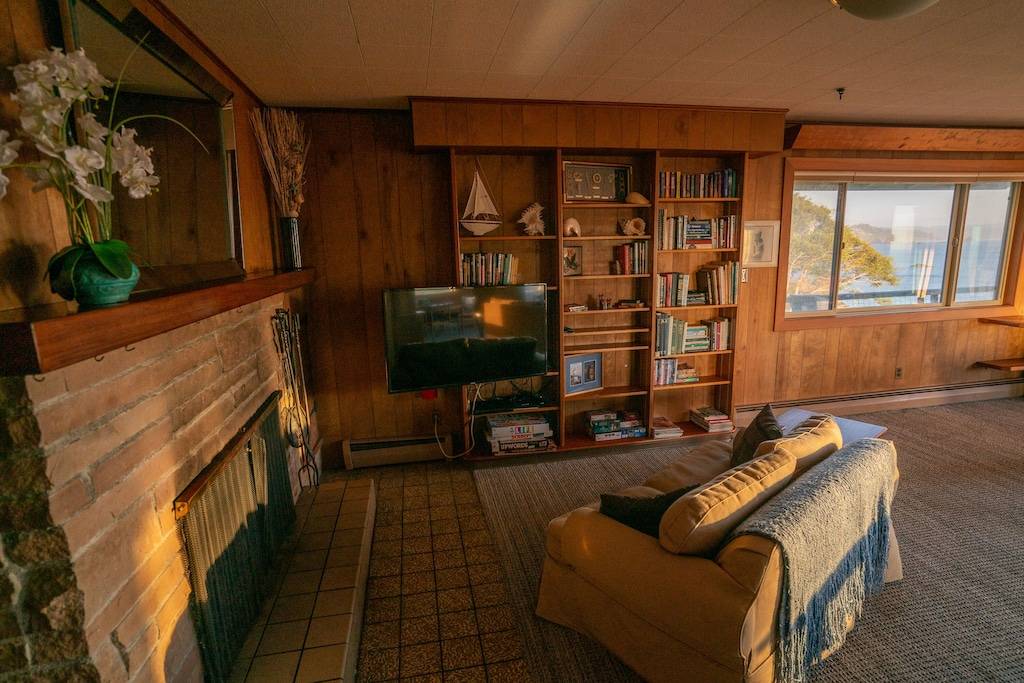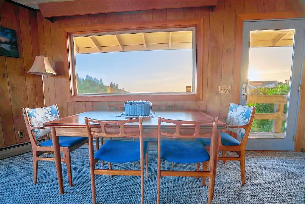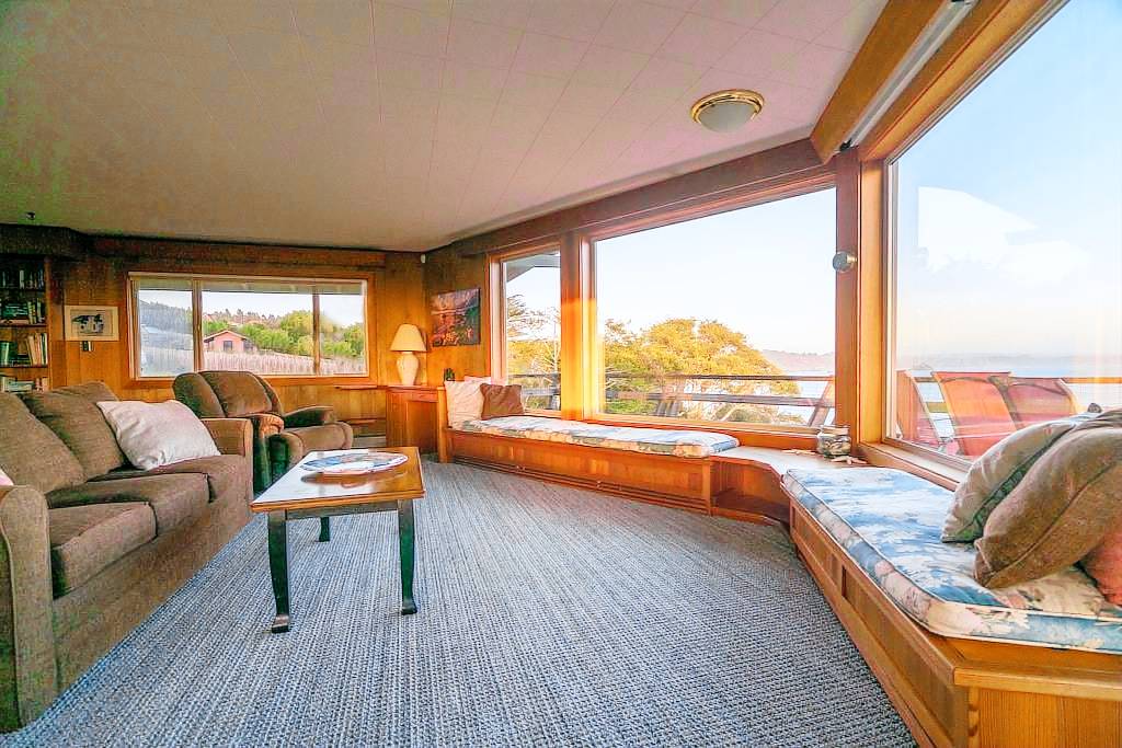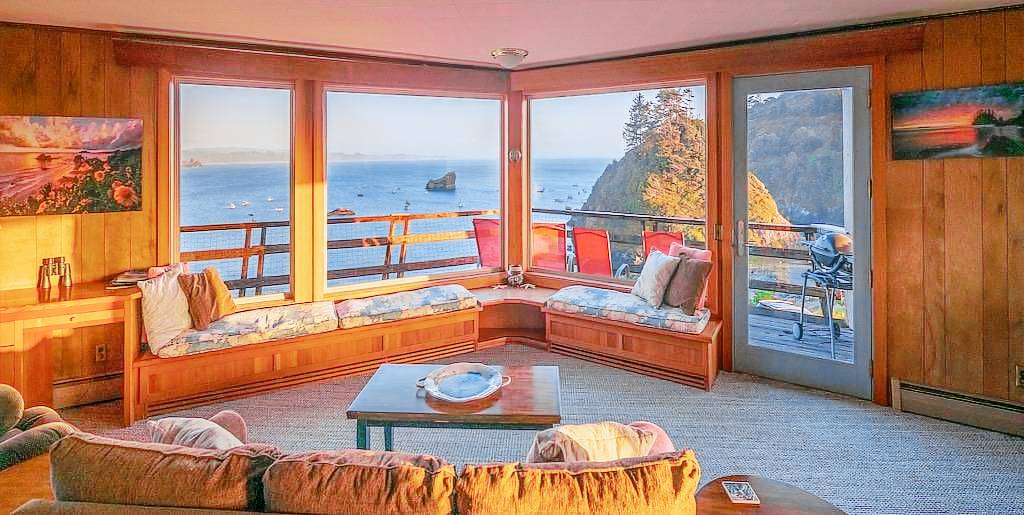 Spacious living room with wall-to-wall windows overlooking Trinidad Bay and south to Eureka and Cape Mendocino. The house is equipped with WiFi and a 45′ flat screen LCD tv. There is a wraparound deck facing the ocean, the perfect place for a barbecue! The house is located at the end of a road at a quiet location. You can watch the whales from the comfort of the couch when they come by Trinidad.