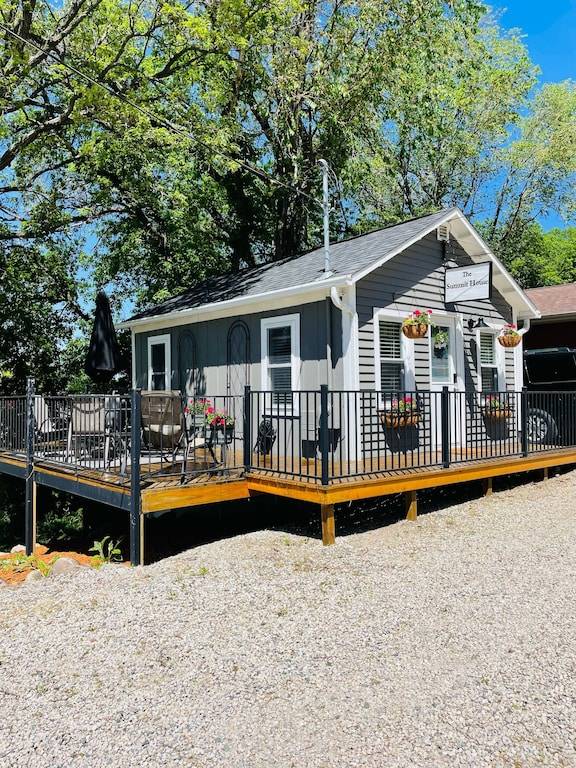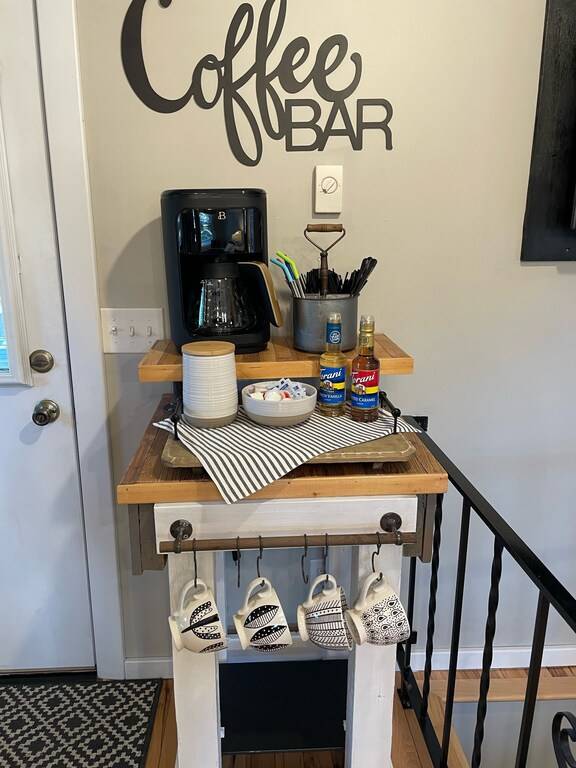 The UPPER LEVEL has a kitchenette that has a double-burner stove top unit. Brand new air fryer that has options to bake, broil or toast. Mini fridge with small freezer compartment. Coffee bar stocked with essentials. Brand new utensils, silverware, pots and pans and other kitchenware. High top table with four stools. Sleeper sofa, radio and Roku TV. Electric air conditioner that provides comfortable coolness to both levels. Baseboard heating that provides comfortable heat.