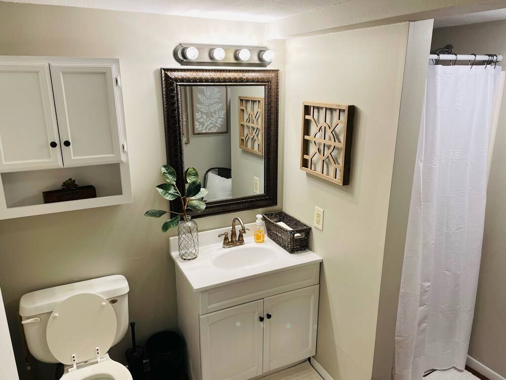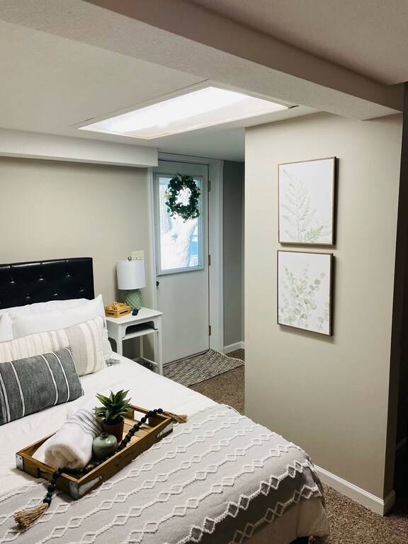 The LOWER LEVEL has a queen size bed, electronic charging station, electric fireplace, Roku TV, closet with shelving, fan, small cupboard table stocked with games, cards and books. Bathroom with shower. Walk out to grass area where you can play yard games or have a bonfire. Four lawn chairs and roasting sticks.