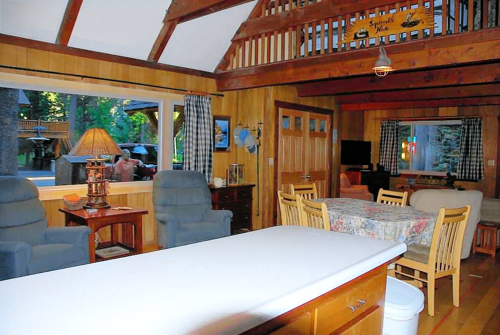 Squirrel’s Nest is the quintessential lake cabin with granite stonework, wood-burning stove, high-end linens and beds, and tree-shaded decks. Set on a corner across the street from the lake, the cabin is two blocks from the West End Beach.