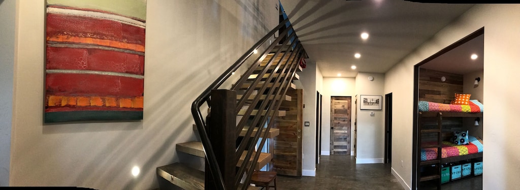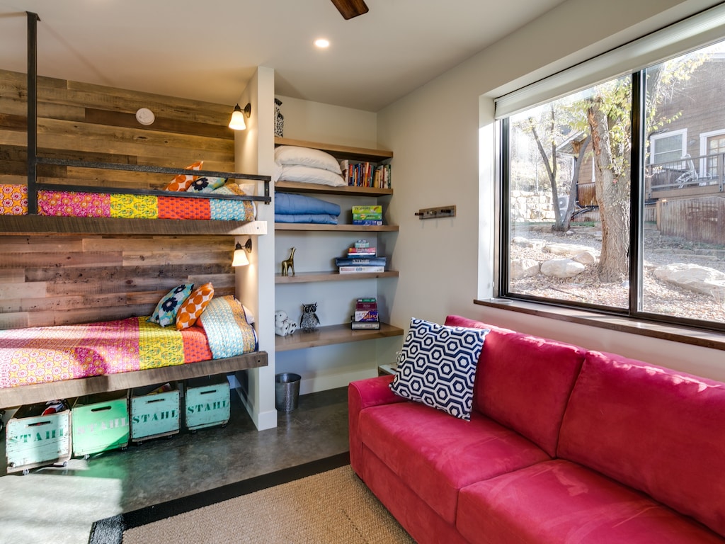 Downstairs, there are three bedrooms that share a bathroom. The second bedroom has a king-size bed and the third bedroom has a queen-size bed. The fourth bedroom, also known as the den, has two hand-built barn doors and features one set of built-in bunk beds and a sturdy, comfy American Leather queen pull-out sofa.