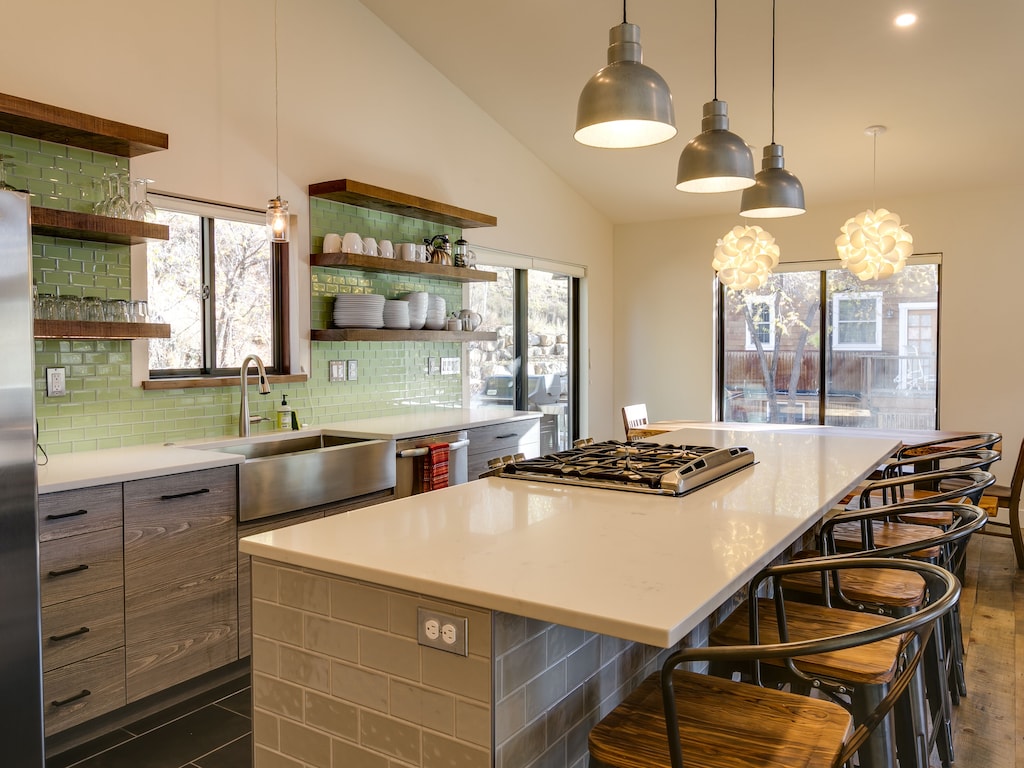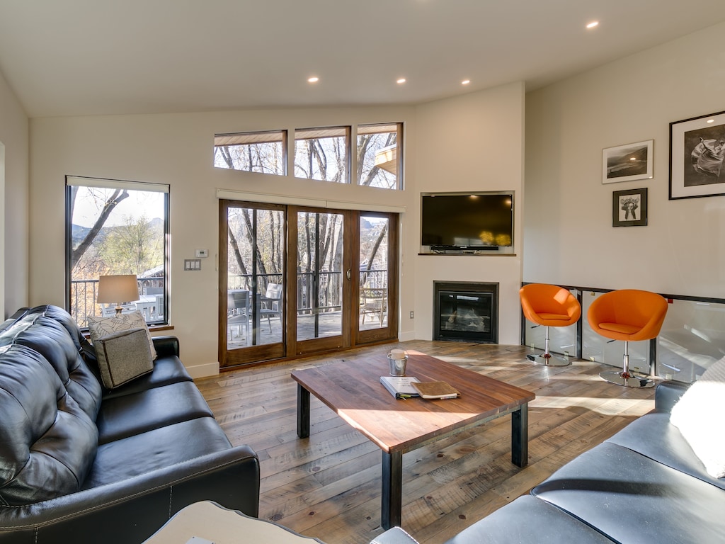 The Durango Hideout’s great room features vaulted ceilings, a gas fireplace, reclaimed wood floors, big comfy couches for movie-watching and game-playing, and a hand-built dining table that seats 10. The open kitchen has stainless steel appliances, every tool a cook could want, and an island bar that seats five and is great for casual entertaining.