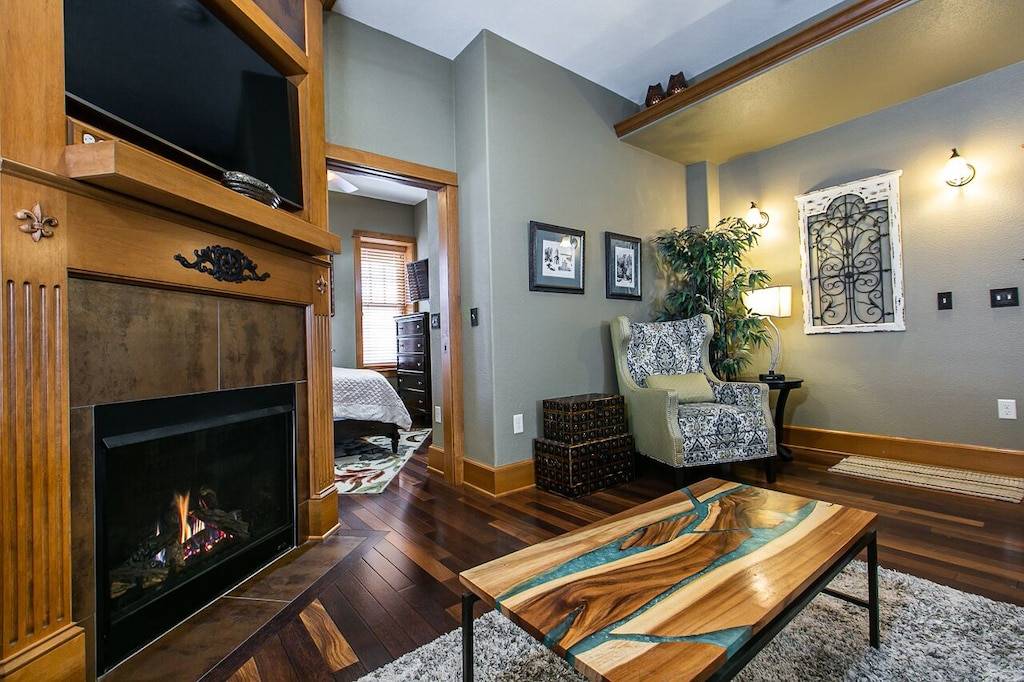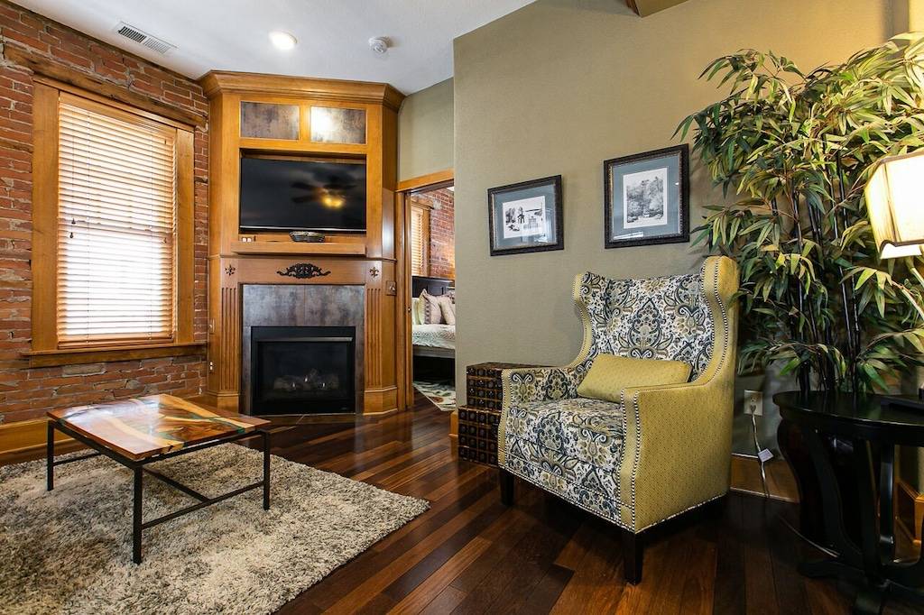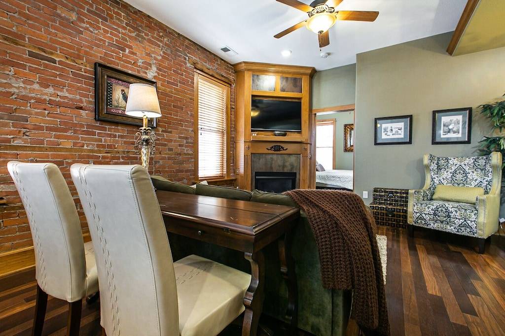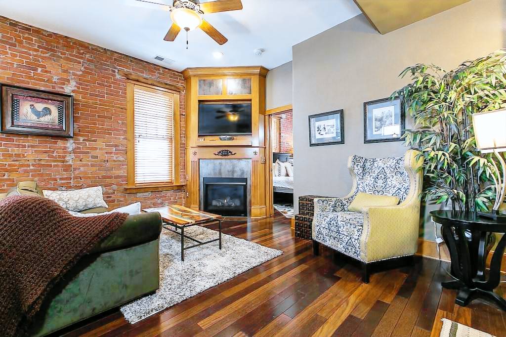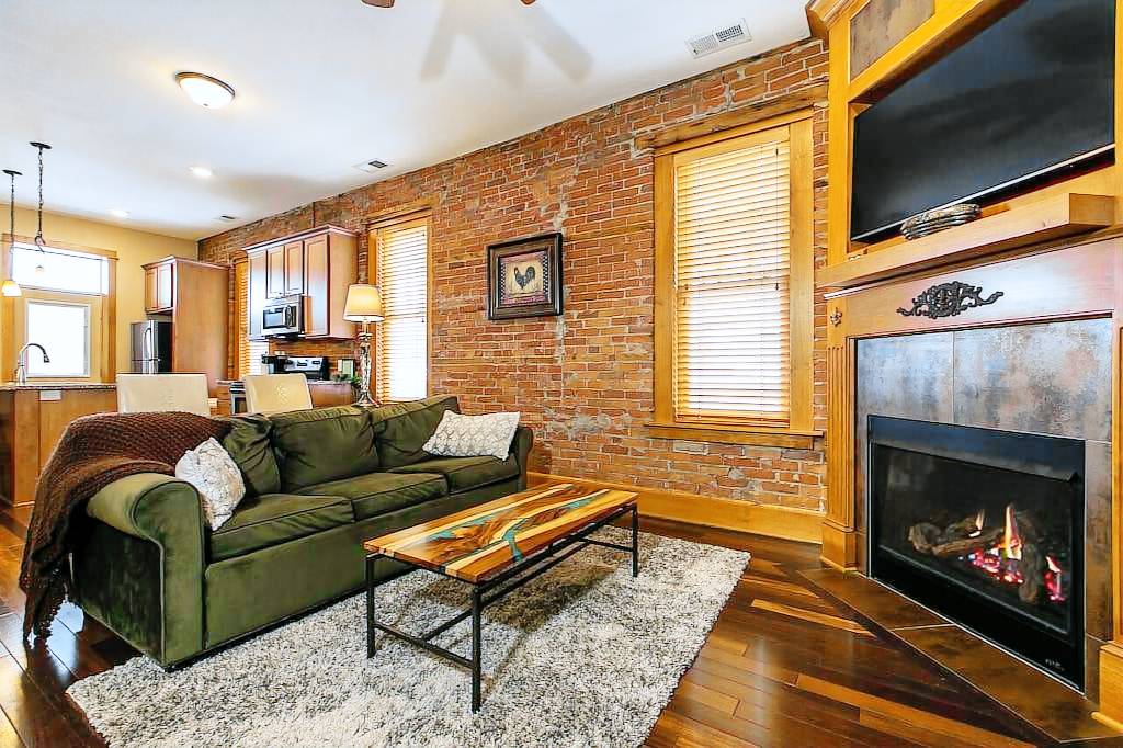 No expenses were spared on this beautifully decorated suite! The Fleur de Lis, a traditionally styled unit with hints of French Dubuque, is located in the downtown Millwork District on the second floor. It is ideal for one couple but can sleep up to 4. Perfect for a romantic get-away or business, the Fleur de Lis has 1 bedroom, 2 full baths, ready to cook-in kitchen, gas fireplace, spacious living room and private hot tub on the balcony. The queen size bedroom boasts a spacious en suite and the sofa in the living room pulls out into a bed when needed. The unit is within walking distance of many amenities in downtown Dubuque.