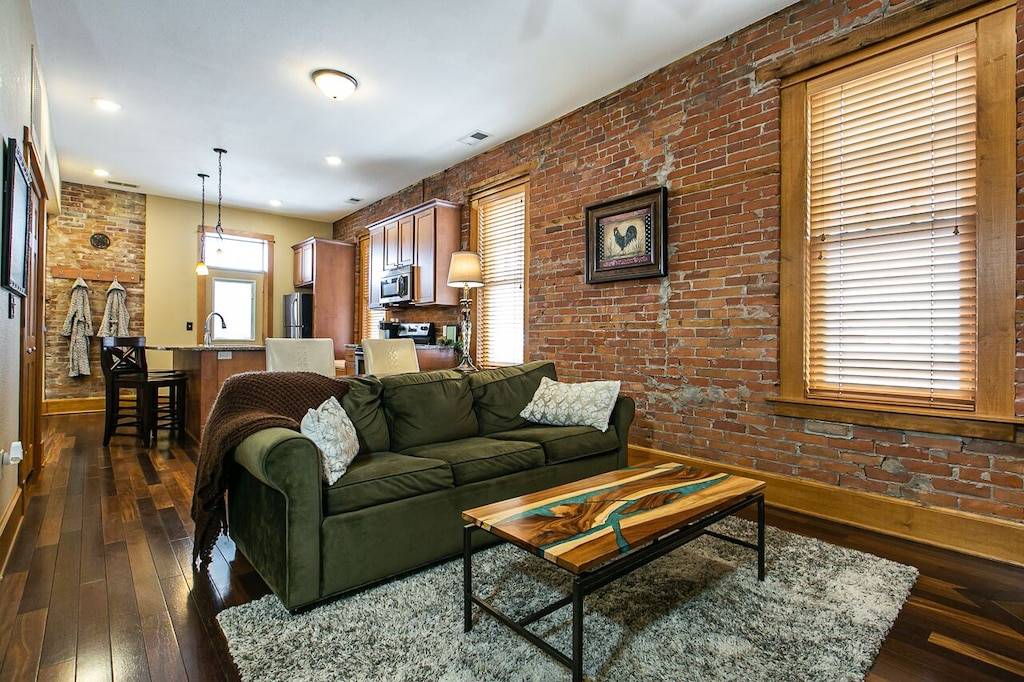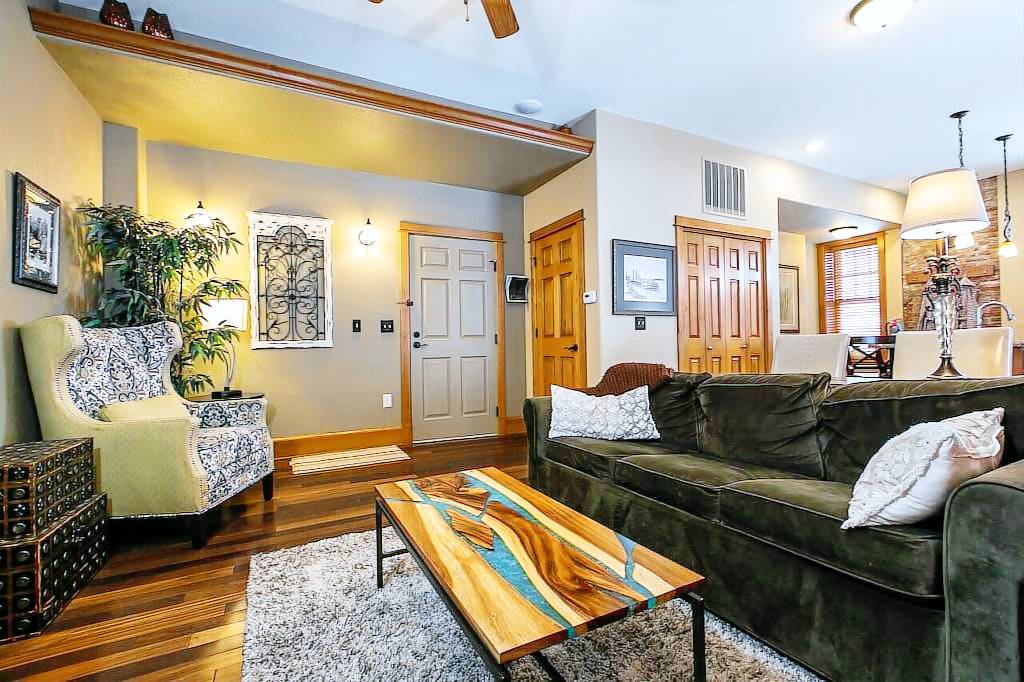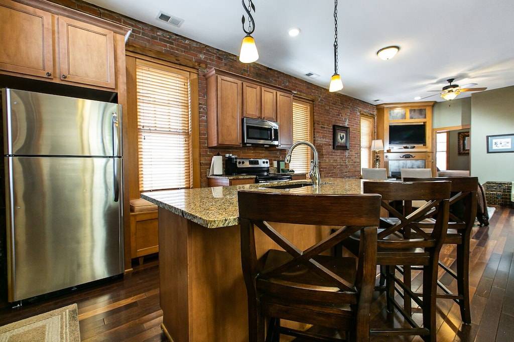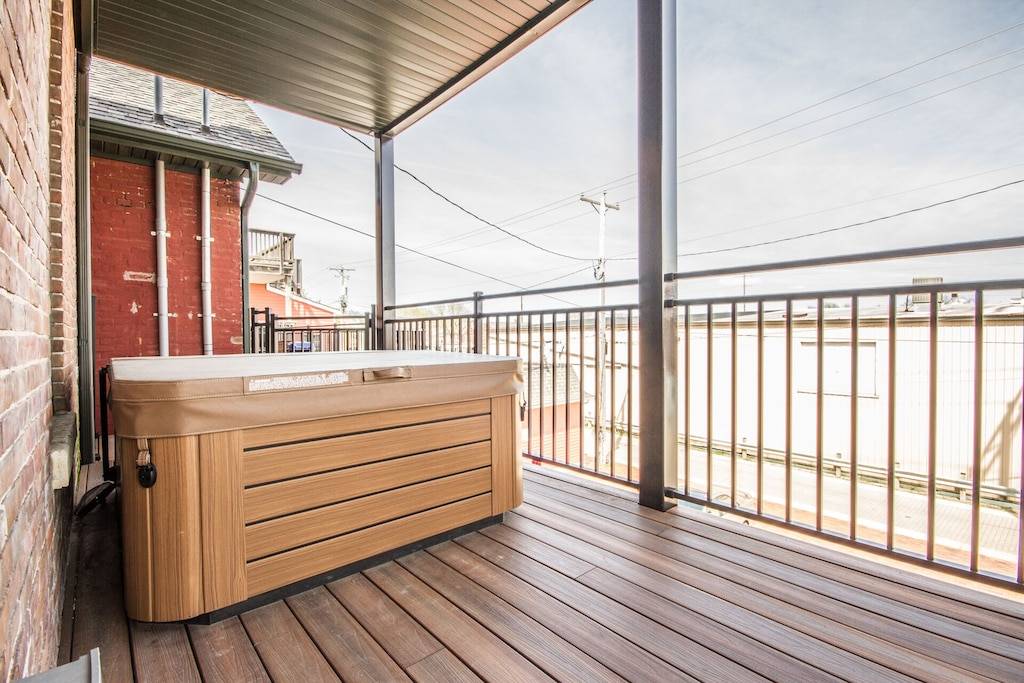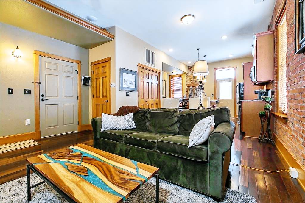No expenses were spared on this beautifully decorated suite! The Fleur de Lis, a traditionally styled unit with hints of French Dubuque, is located in the downtown Millwork District on the second floor. It is ideal for one couple but can sleep up to 4. Perfect for a romantic get-away or business, the Fleur de Lis has 1 bedroom, 2 full baths, ready to cook-in kitchen, gas fireplace, spacious living room and private hot tub on the balcony. The queen size bedroom boasts a spacious en suite and the sofa in the living room pulls out into a bed when needed. The unit is within walking distance of many amenities in downtown Dubuque.