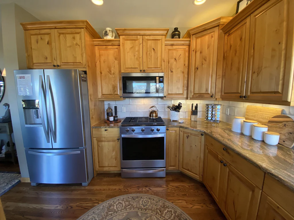 The living areas features windows boasting stunning views of Mary’s Lake, creating a welcoming and cozy atmosphere for all to enjoy. There is a gas fireplace, televisions, DVD players, games, books, and Wi-Fi for guests to enjoy the utmost indoor entertainment after a long day outside. The fully-equipped kitchen has all that guests will need for enjoying a delicious home-cooked meal.