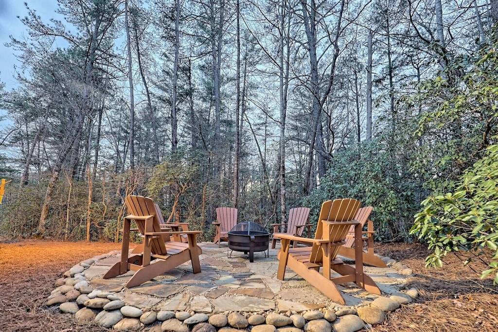 From the den or the primary bedroom, you have access to the back porch where you have seasonal mountain views. Once the leaves begin to fall, you can see breathtaking mountain ranges. With four armchairs and a bench, there’s plenty of seating to enjoy all your meals outside when the weather is nice. Grill out, relax in the lounge chairs, or play Jenga or a game of cards.
