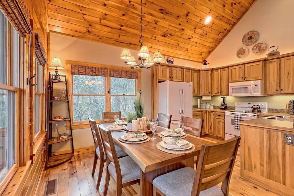 When you enter the cabin, you’ll be amazed by the spacious den and kitchen area. The kitchen table has seating for six, and there are 3 bar stools as well. The kitchen itself is well-stocked and guests have commented that it has everything they needed to cook every night. You’ll notice the corner cabinet in the kitchen. The shelves have been left empty, so you have room to store your groceries.