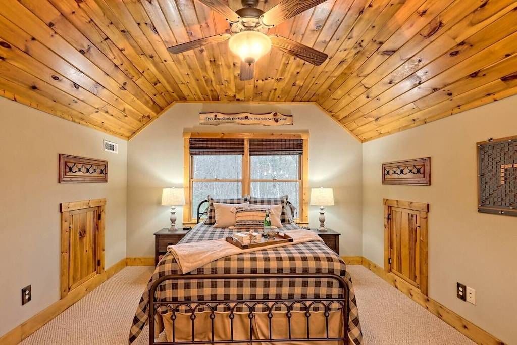 There’s a loft bedroom with some really cool “wall” games, Connect 4, Scrabble, Tic-Tac-Toe, and Checkers. Both kids and adults will enjoy playing. Check out the custom light fixture hanging above the dresser in the loft. It was made from a mountain laurel branch found on the property.