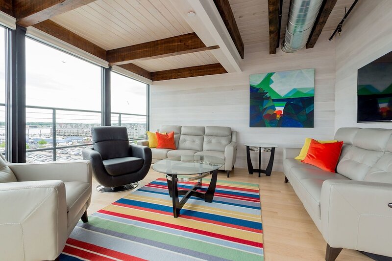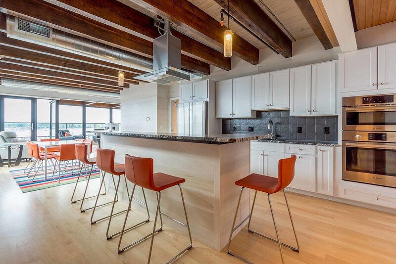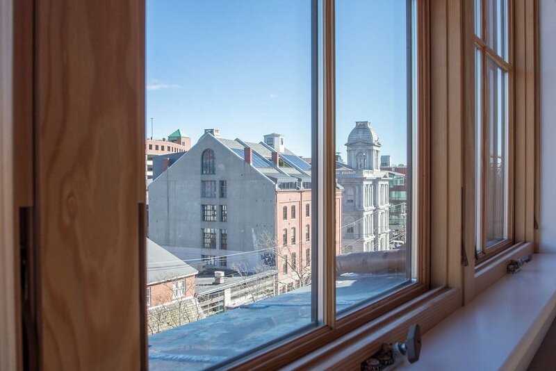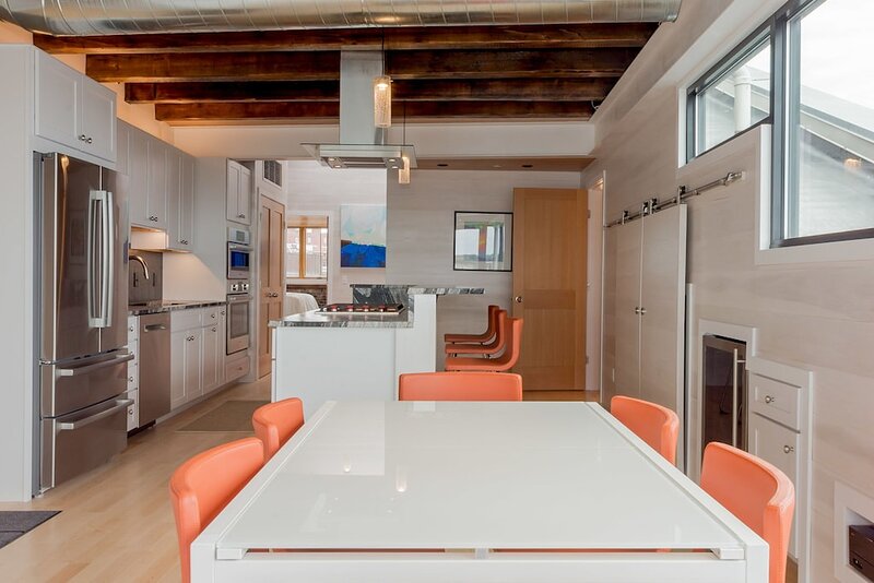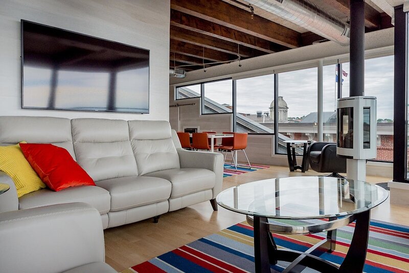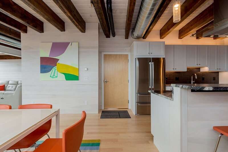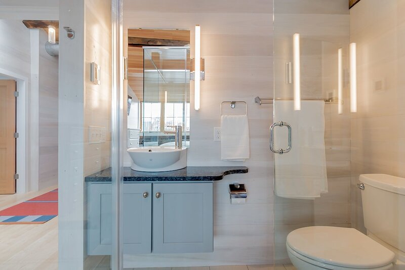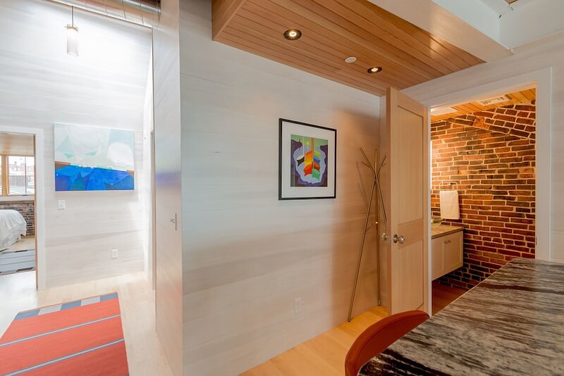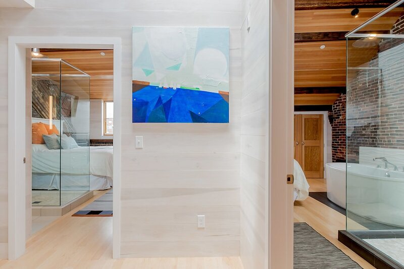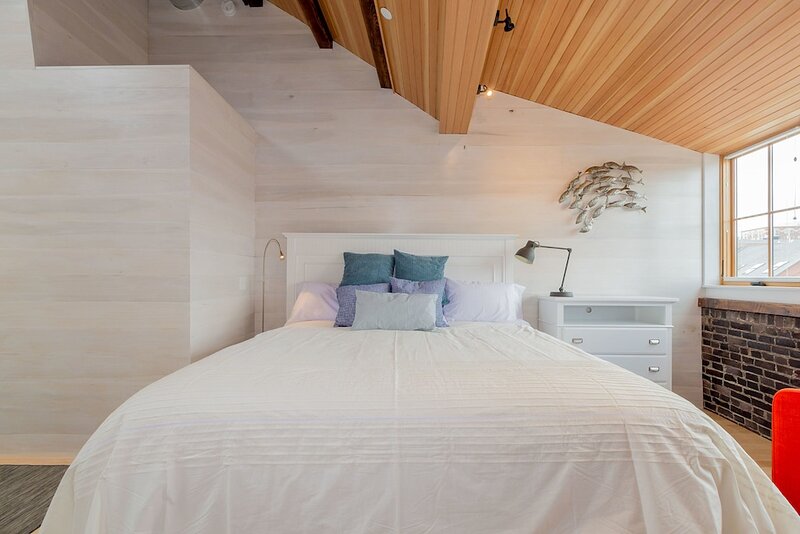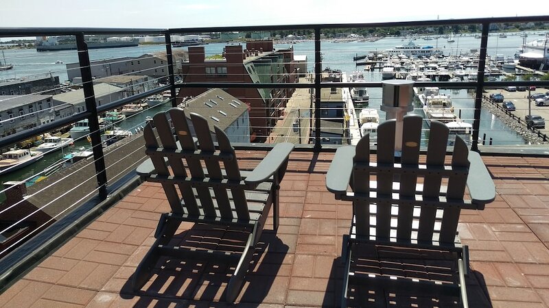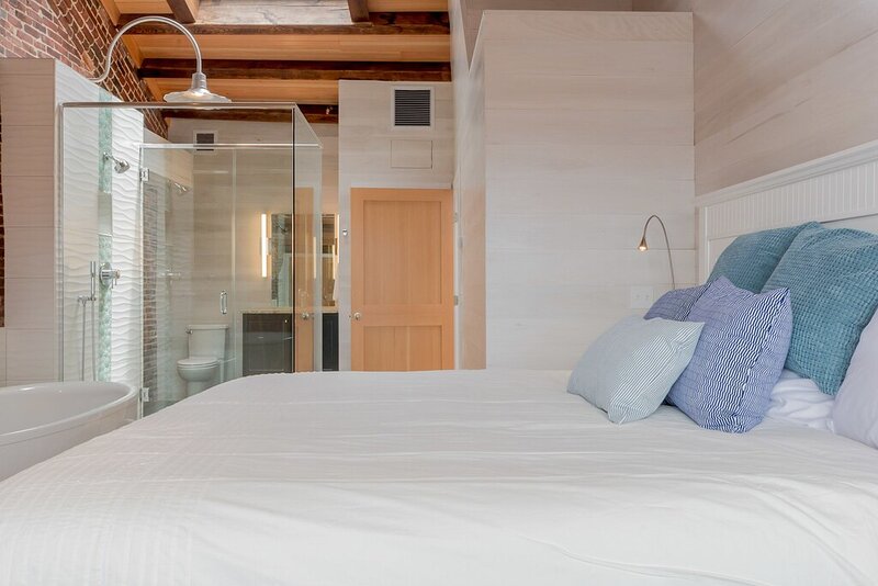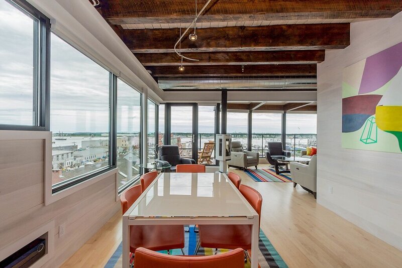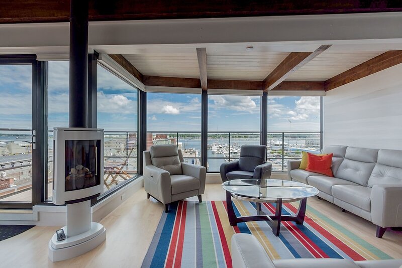 2021 City of Portland Registration #5280 Back-to-front top-floor penthouse suite with modern amenities, exposed beams and brick, whitewashed poplar walls. Rooftop deck with 360 degree views of harbor and city. A monthly parking for one car is provided for the lot next door. Separate master suites, each with custom shower, hand wand, and heated bathroom floor; one with soaking tub. Very desirable exposed brick and vaulted ceilings with skylights in each suite. Spacious, modern kitchen with white shaker cabinets, wine cooler, stainless appliances including gas cooktop, pots and pans, bowls, wine glasses, cutting board, dishware, 12-cup auto drip coffee maker. granite-top island and bar stools. Dining table next to kitchen and living area in open concept space.Gas-fired Jotul stove and floor-to-ceiling windows in living room.Washer/dryer in unit.Individual heating and air conditioning.Easy elevator access. Wi-Fi, satellite TV, built-in speakers with stereo system, closet and pantry space, linens, bedding, pillows, paper products, hair dryer, shower essentials, iron and board. Very safe and secure. Parking pass for one car included for the lot next door. Leave your car and walk everywhere. On Portland’s working waterfront, overlooking the very popular Dimillo’s Marina. Watch the yachts come and go and stop at the famous Dimillo’s floating restaurant for dinner or a drink. Located in the heart of the Old Port on the working waterfront, this is Portland, Maine at its core. See a mix of lobster boats and fisherman as well as busy professionals. Perfect for: *Retirees looking for comfort and ease *Couples interested in relaxing when not exploring the city by foot Must see spots nearby: *Harbor Fish: the go-to spot for just-caught fish *Casco Bay Ferry: visit the islands *J’s Oyster: classic cocktails, seafood, and an unbeatable mix of locals and tourists alike *The Holy Donut: Maine potato donuts *Exchange Street: shopping *Novare Res Bier Bar: large selection of craft brews Whole Foods, Trader Joe’s, and Hannaford within a 1 mile drive. Less