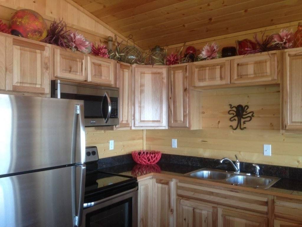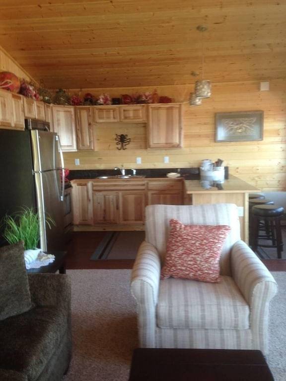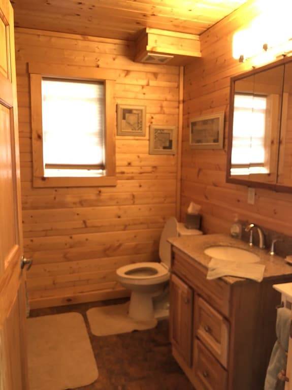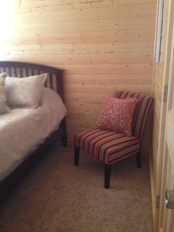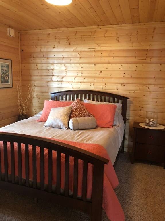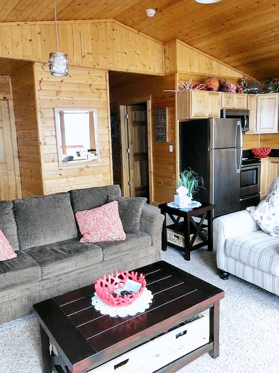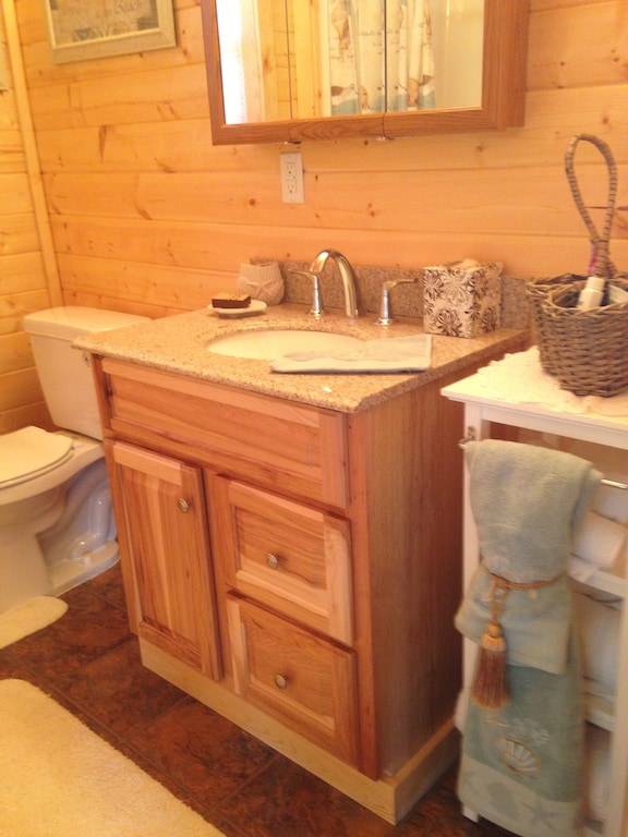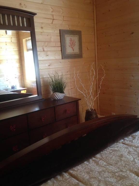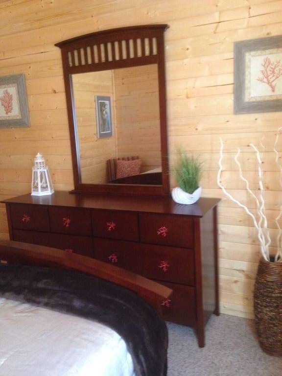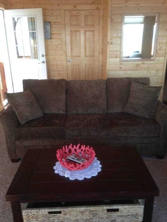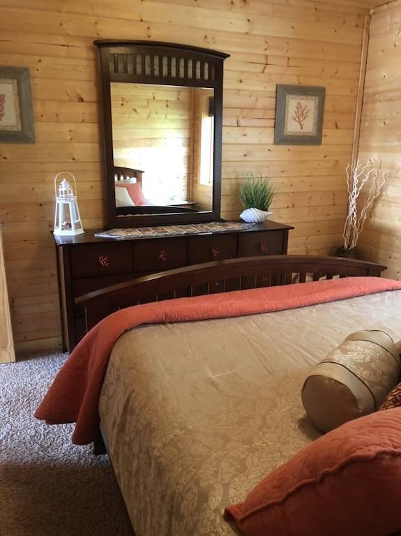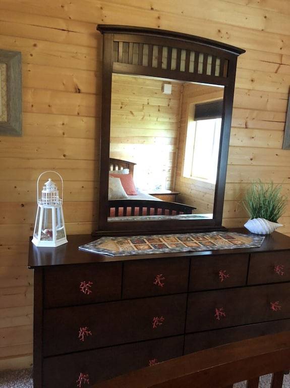 The cabin sleeps four adults and can sleep two small children. The bedrooms offer queen sized beds with plenty of dresser and closet space.