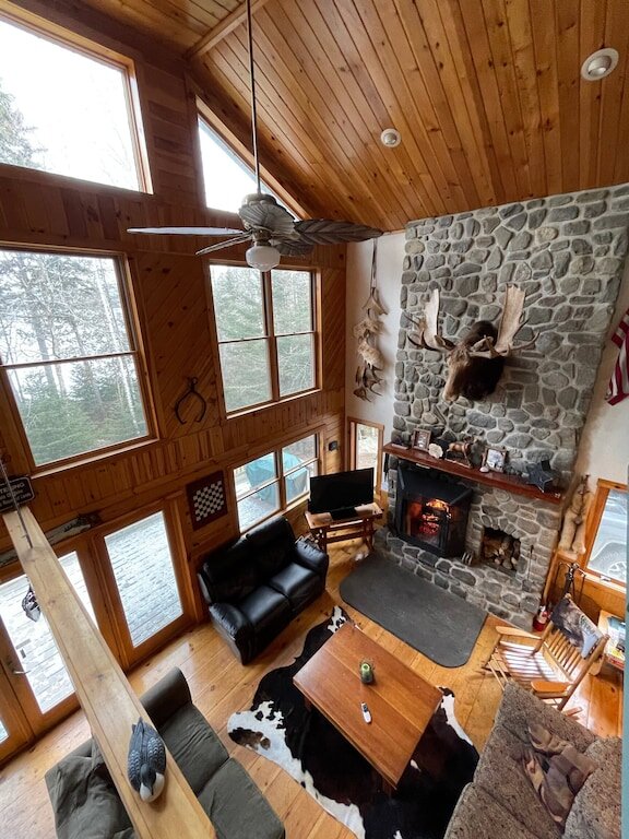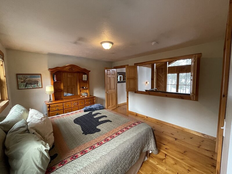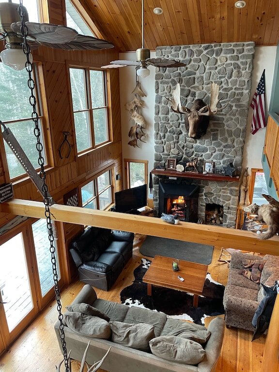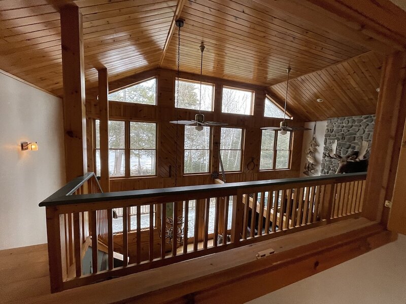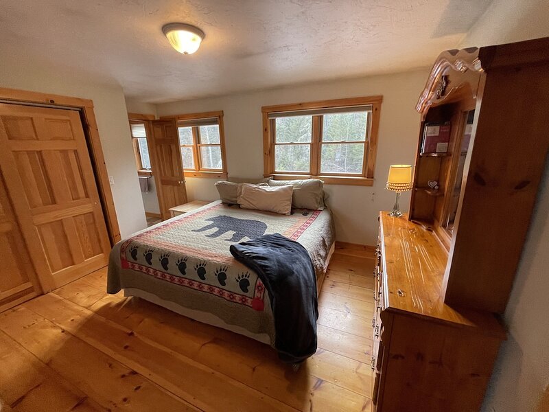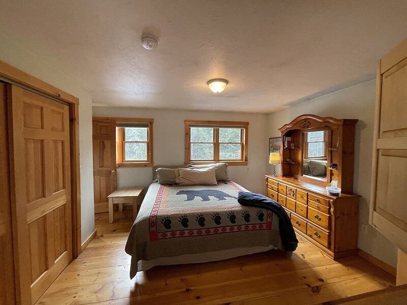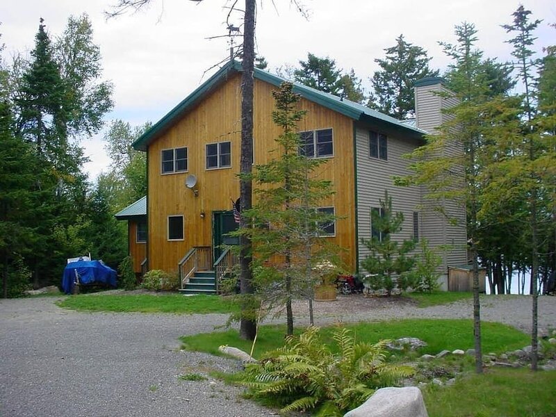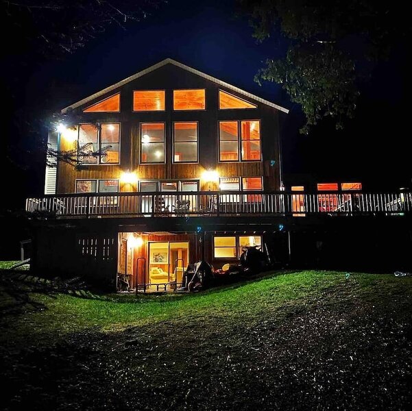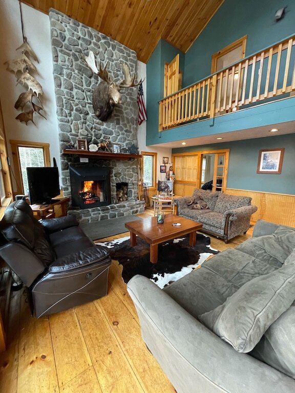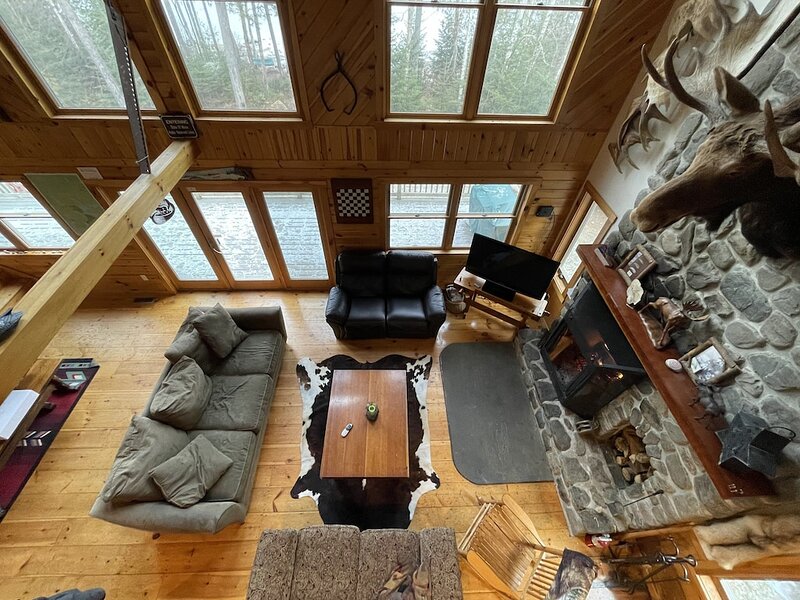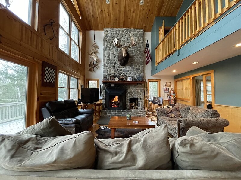 This highly functioning waterfront home is located in the heart of the historic Rangeley Lakes. Bring your friends and family for an adventurous getaway while you take in the serenity of the pine-scented air and mountain waterfalls. Come see the various untouched wildlife living in your backyard. Swim in the crystal clear lakes and paddle along the peaceful shorelines. Enjoy world-class salmon and trout fishing right off your dock. The Steiman Estate, a private waterfront home, features 4 bedrooms and 2.5 bathrooms, an open concept living room featuring a 30-foot fireplace and television and entertainment system (wifi, tv, Direct TV, SmartTV), a large finished basement complete with a large flat-screen TV and Cable. The basement features a private entrance, two Twin-sized Bunk Beds with Tempurpedic mattresses, 1 full bath, and a separate bedroom! There is an abundance of parking on the property. Other outdoor space includes natural landscaping and a wrap-around deck, fireplace with seating, hammock, large dock (seasonal). Our home is quietly located on Mooselookmeguntic Lake. An outdoor gas grill(propane provided) and a Charcoal grill (charcoal not provided) and 2 canoes* are available to use at your leisure. *additional fee Less