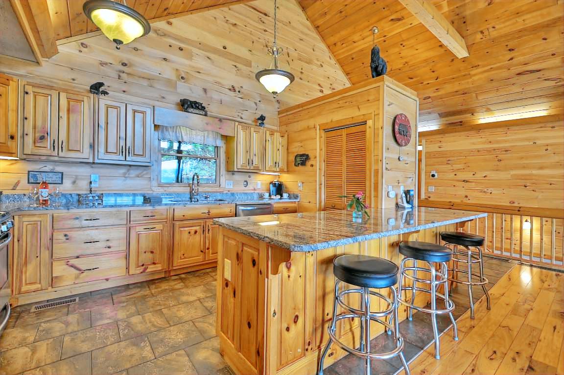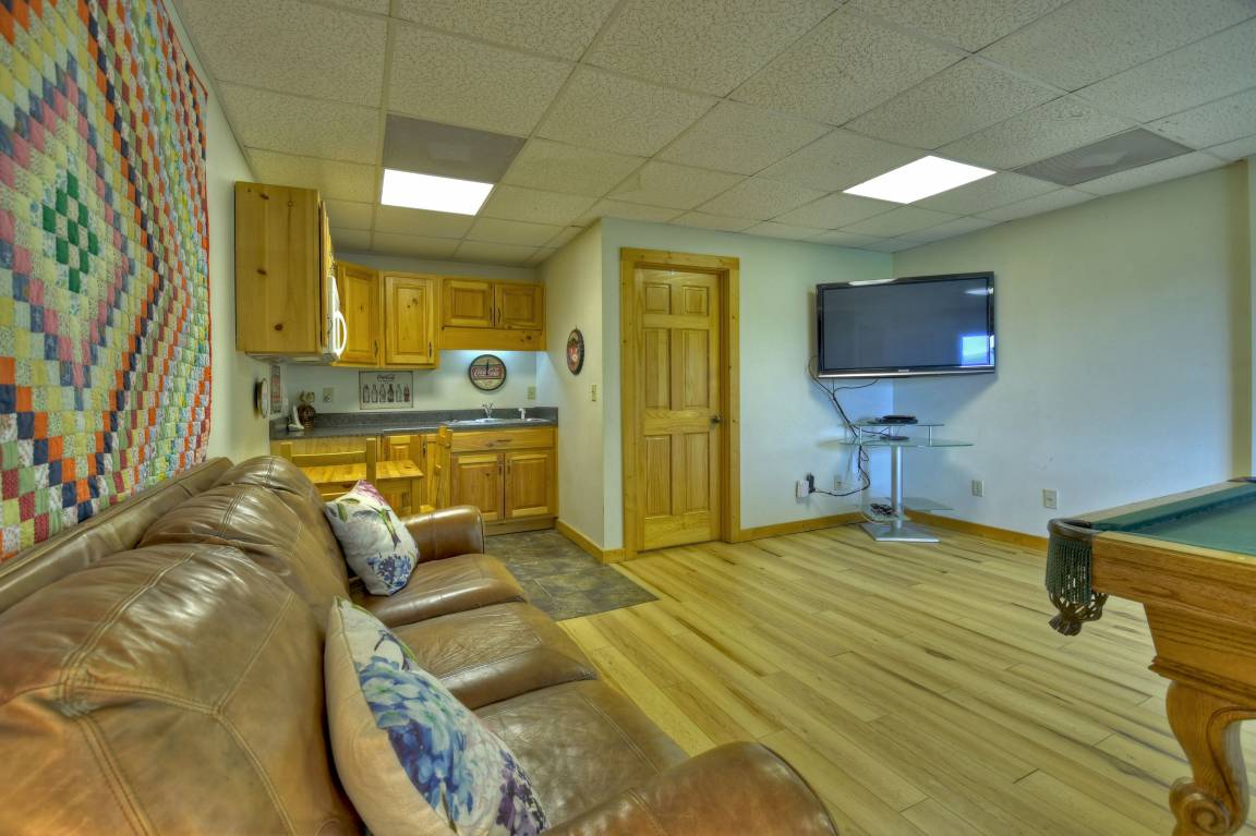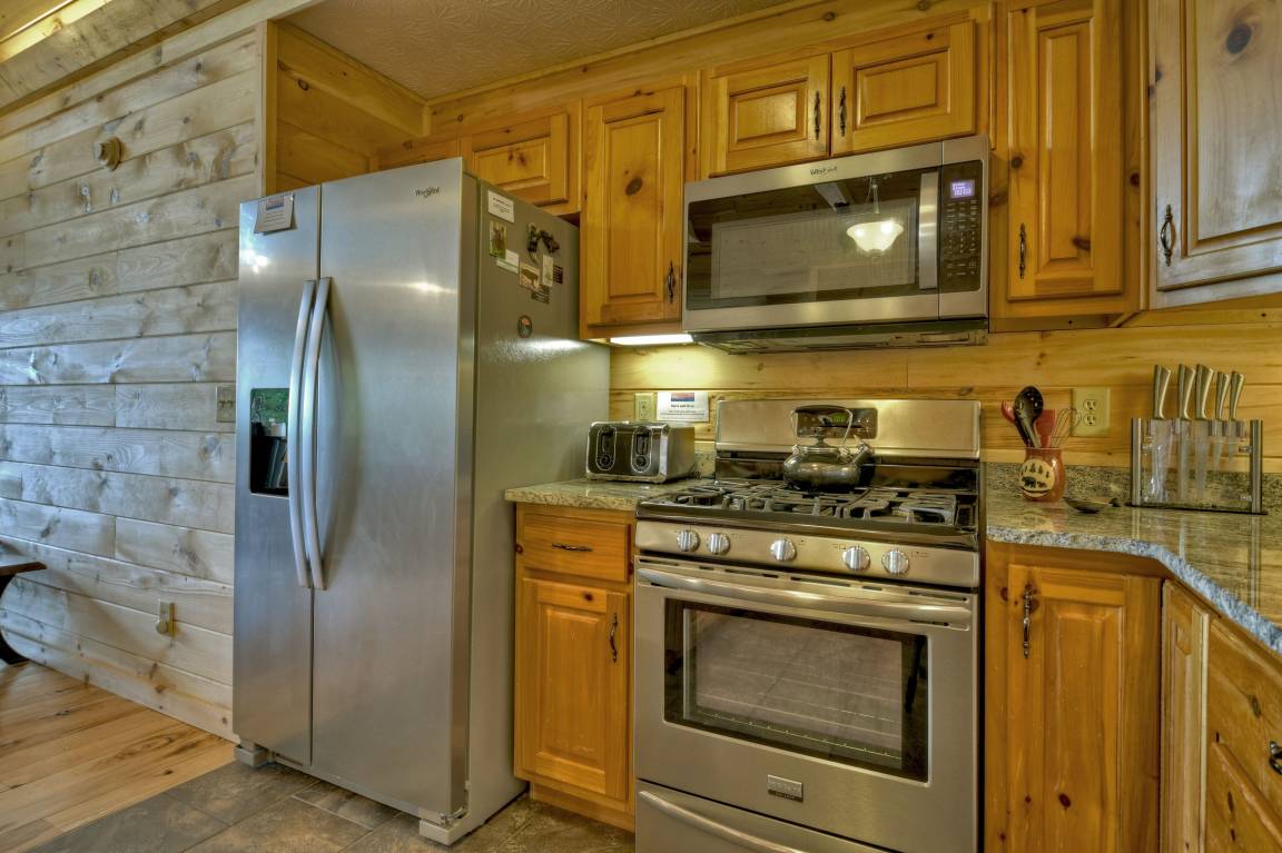 The kitchen is fully equipped with all the necessities and more. Gorgeous granite counter-tops and upgraded appliances make cooking your meals a dream come true. After a full dinner of fresh caught Georgia Trout, local grown veggies and a bottle of wine from one of the many North Georgia Wineries, you will be ready to head down to the terrace level for some friendly competition. Grab a pool stick, pick your partner and play a few games of pool. This luxury Ellijay cabin rental comes with all the essentials you will need to have a fun and relaxing North Georgia getaway with the whole family.