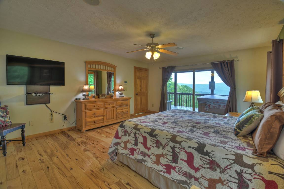 The inside of Hummingbird Haven rental cabin in Ellijay is just as decadent as its surroundings. You will be mesmerized by the large stone fireplace that sits adjacent to the floor to ceiling windows, where you will be able to enjoy the Georgia mountain views from every seat in the cabin. You can cuddle up by the fireplace with a good book or gather with the gang in the living room to watch the big game on the 65″ flat screen TV that comes fully equipped with a Blu-ray/DVD player and DirecTV HD DVR plus all those great movie channels (HBO, Showtime, Starzs etc).