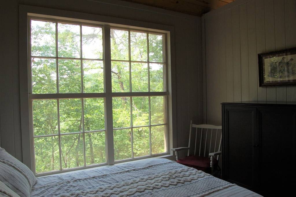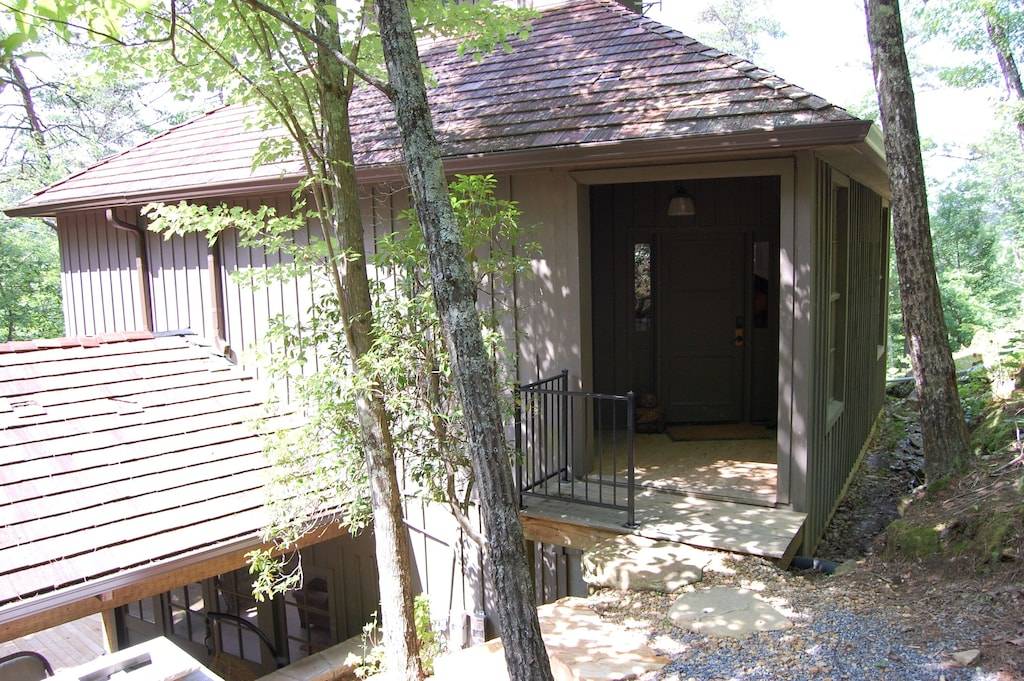 The property is 18 acres of beautiful forest and rock formations, situated on the side of a canyon that overlooks Johnnie’s Creek. There are two waterfalls on the property, the largest of which is visible from the deck and side patio. There is nothing more relaxing than sitting outside and listening to the sound of the waterfall. You are more than welcome to explore and hike throughout our property to fully enjoy it.