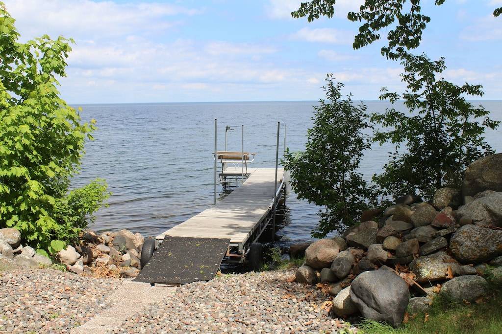 Your family will truly enjoy our 1800 sq. ft. home featuring 268 feet of east-facing Mille Lacs lakeshore with amazing views from the huge deck. Beautiful and rustic home with all the modern amenities. The main living area overlooks the lake and provides a breathtaking sunrise for the early risers. Swim off the dock, fish, or just enjoy the views. The fishing is good right out in front and pretty much weed-free. Inside our family-friendly home, you will appreciate just how comfortable and warm it feels with a nice open concept. A classic stone fireplace compliments the living room along with comfortable furnishings. All appliances needed for your stay include a washer/dryer, dishwasher, Jen-Air stove, 2 refrigerators,2 coffee pots, microwave, soft water, and tankless hot water heater so you never run out of hot water. Everything needed for cooking is in the kitchen. Fresh linens, soft towels and beach towels included. The bathrooms include shampoo, conditioner, hairdryers, body wash and only Charmin.