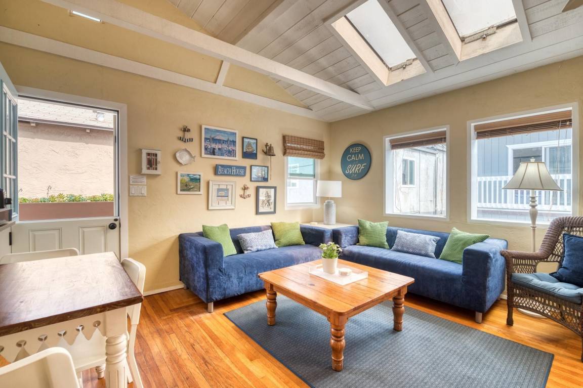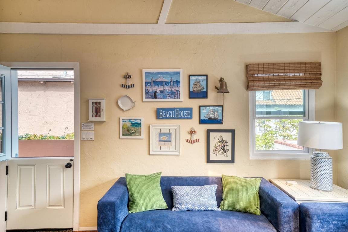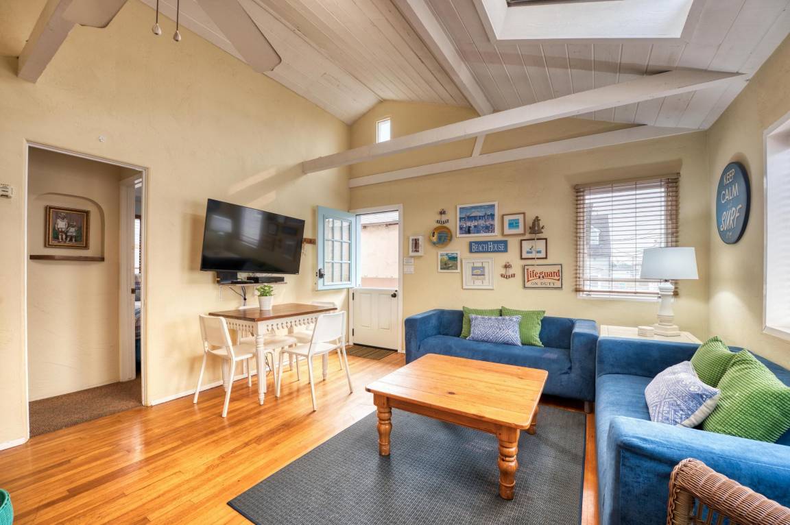 The Dollhouse” is a guest apartment located over the garage of a lovingly maintained home six blocks north of Belmont Park on one of the loveliest courts in Mission Beach. Located just steps away from the Pacific Ocean, this charming and highly rated vacation rental sleeps 5 making it a perfect retreat for singles, couples, and small families. Built in the 1930’s, the dollhouse features original wooden floors and other charming features.