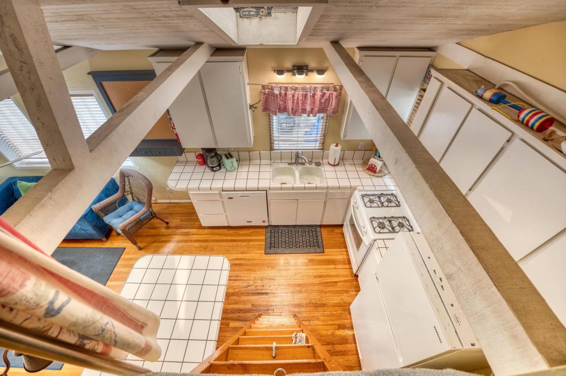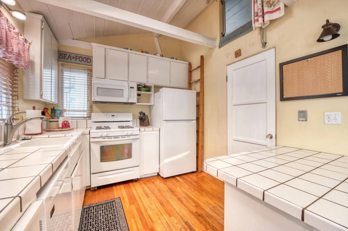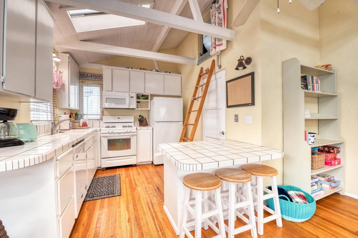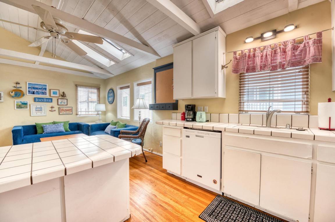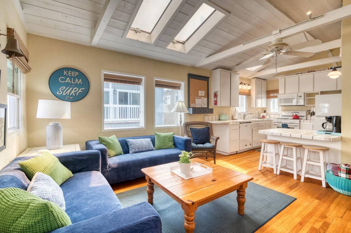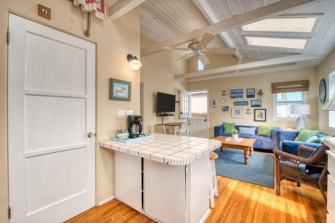 Enter through the blue Dutch door to a bright and comfortable living area that is open to a fully-equipped kitchen. The vaulted and beamed ceiling has skylights that let in plenty of natural light. Charming beach decor in all rooms. Kitchen is well equipped with everything you need for your stay including a gas range, microwave, large pantry and plenty of counter space. Counter seating or a small dining table is available for family dinners.