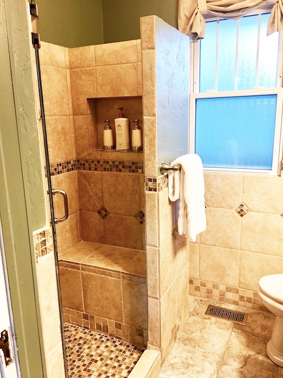 • 1 Bathroom – privately and perfectly centered between the bedrooms. Step into the glass and Travertine tiled spa shower. The glass shower contains a tiled bench and is surrounded by heated Travertine flooring. The new granite raised vanity is sparkling clean! The luxurious new plush towels will leave you feeling like royalty. Vintage glass doorknobs & skeleton keys in each door! So unique!