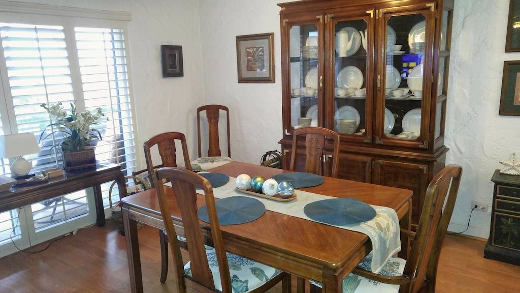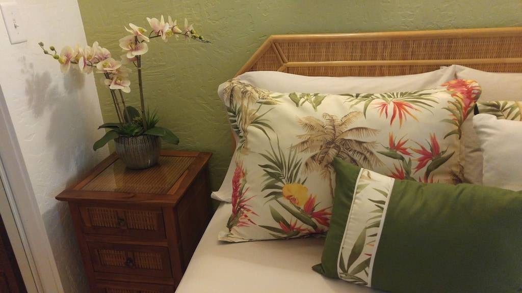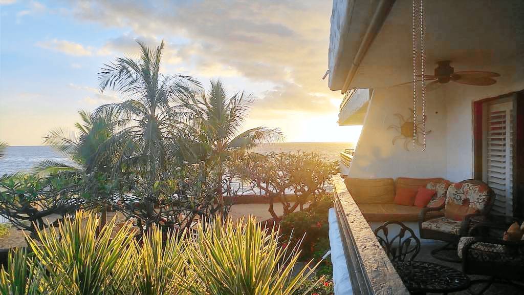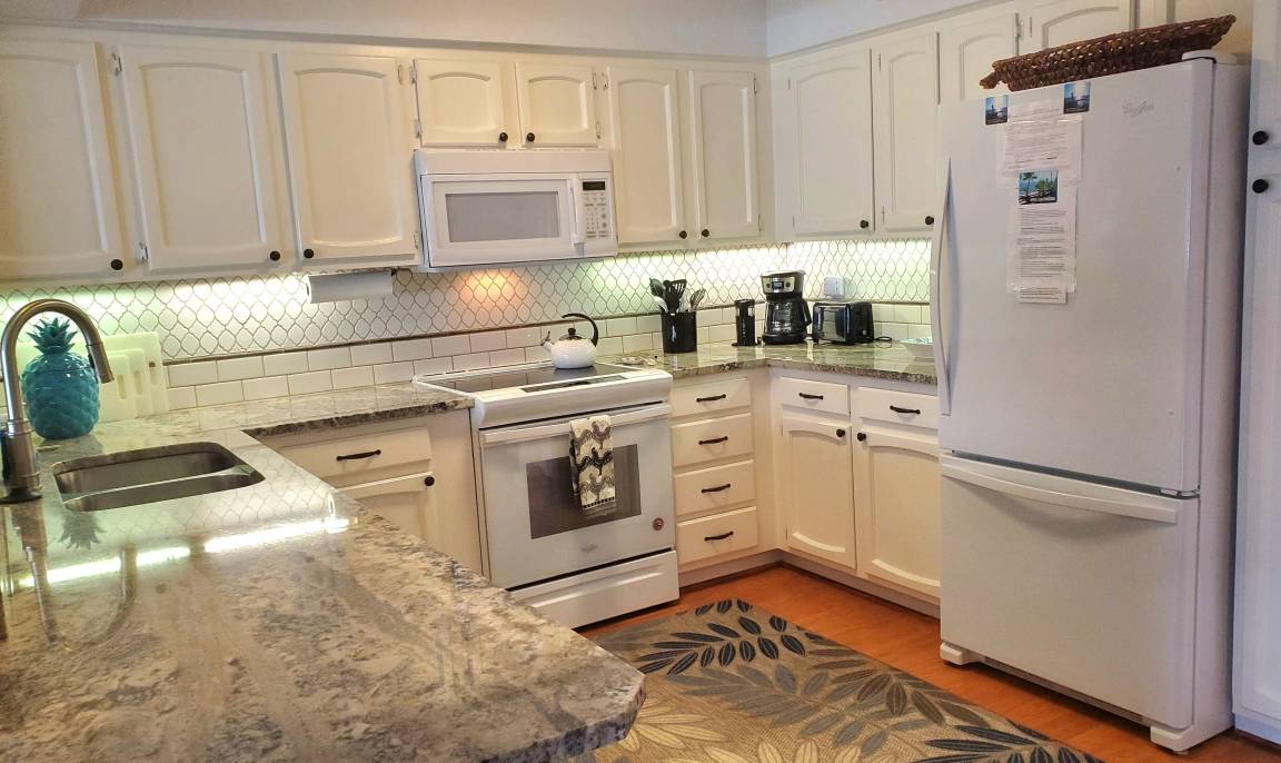You will also enjoy ultra-high speed internet WiFi service, living room with big screen HD Smart TV with Time Warner HD Cable (cable and flat panel TV’s in both bedrooms, too), DVD player and library, dining room and full-sized kitchen. The kitchen is complete with coffee maker and grinder, ice maker, Brita filtered water pitcher, waffle maker, blender, martini shaker, and all the necessary cooking utensils and dishes for preparing meals at home if you choose. The primary bedroom has a king-size bed and private bath with double sinks and walk-in shower; there are sunset ocean views from the primary bedroom. The second bedroom has a queen-size bed and another bathroom just across the hall. There are also beach towels, coolers and a beach umbrella and chairs for your use. We have just completed a major kitchen and bathroom remodel in addition to redecorating and updating the unit to make your stay even more enjoyable. This is a non-smoking property, including inside the condo, on the lanai, and all of the common areas and grounds of the complex.