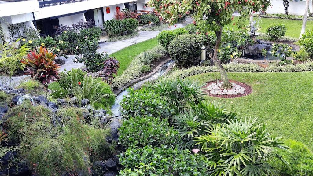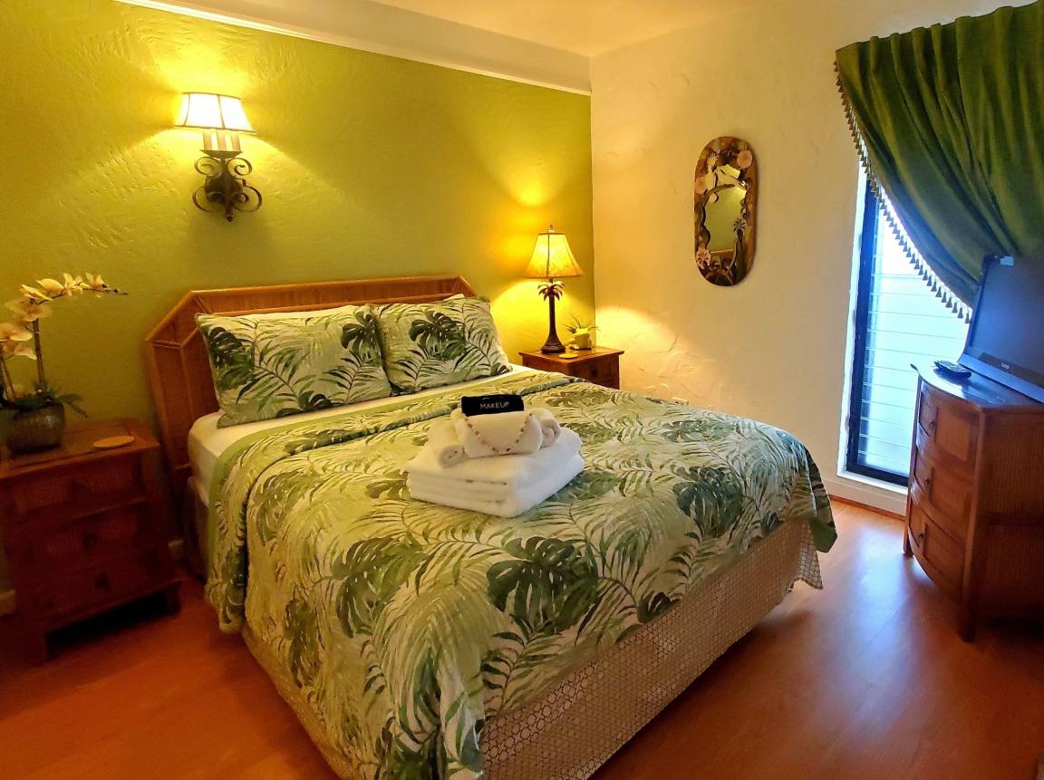 Amenities of the resort complex include lush tropical gardens with fountains and many blooming plants, a courtyard swimming pool, private sand beach with palm trees, cabana with shower and restrooms, gas grills for outdoor cooking, outdoor eating area with tiki torches, and a spectacular ocean-front salt-water pool and sunning area. There is also free secure private parking, an on-site laundry facility, and a commercial building with beauty and barber shop, spa, and convenience store/deli for picking up food items. A small lava rock and sand beach with ocean entry is next door to the complex, and there is an area where you can fish just steps from our front door!