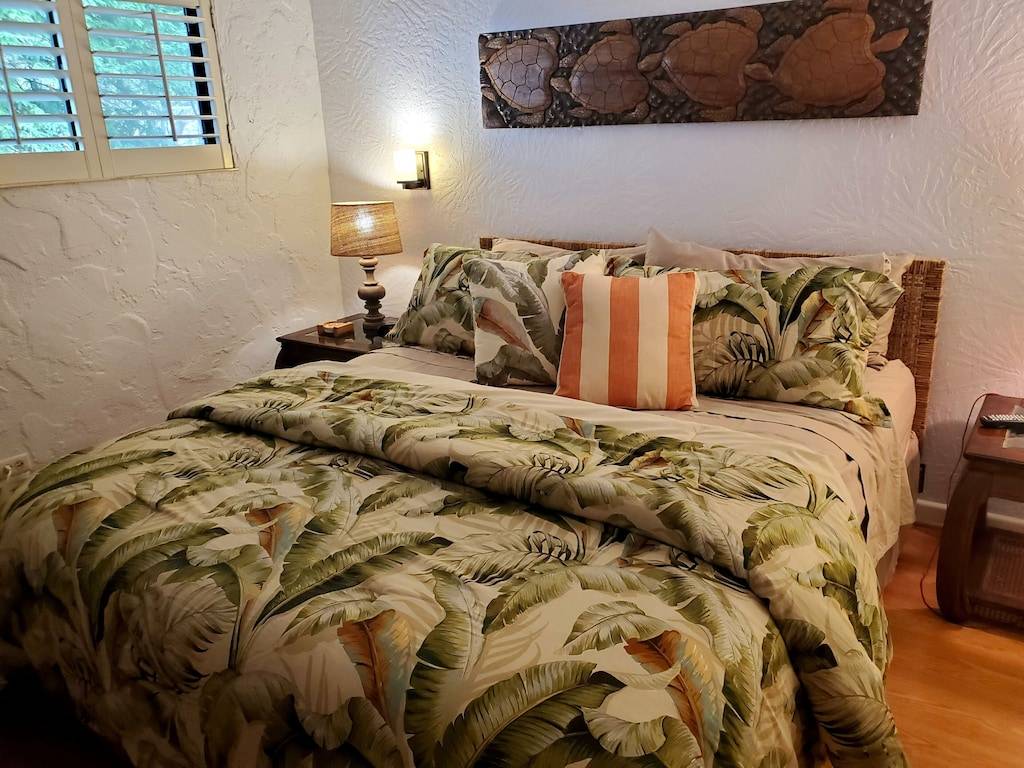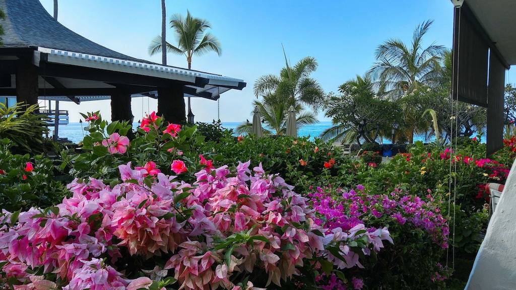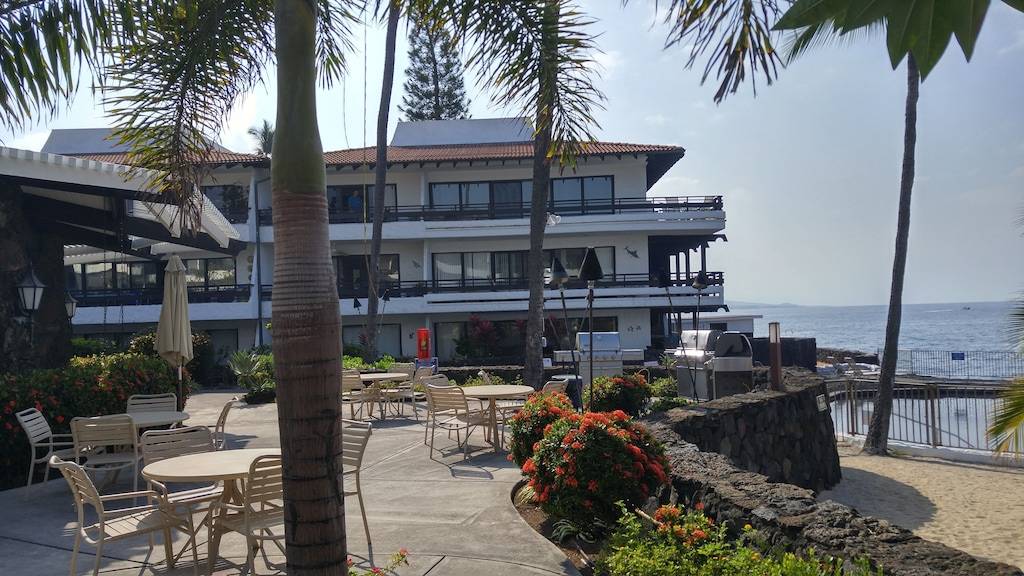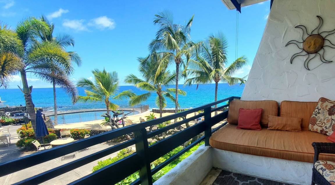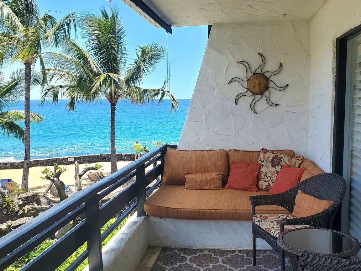 Unwind at this beautiful oceanfront resort property situated in a lush tropical paradise with an “Old Hawaii” feel. Surrounded by heavenly-scented plumeria, flowering hibiscus, ginger and brilliant bougainvillea, your cares will melt away as you relax on your own private lanai, just 100 feet from the ocean! Sip a morning cup of Kona coffee while watching humpback whales or spinner dolphins. Enjoy spectacular sunsets from the private palm-lined beach just steps away, or lie on the lanai’s twin-sized lounger gazing up at the stars while listening to the sound of waves crashing on the lava rocks below.