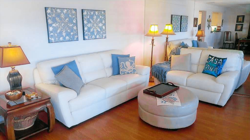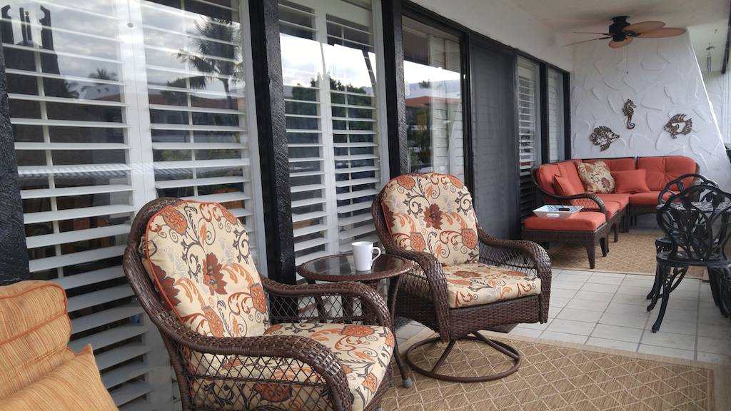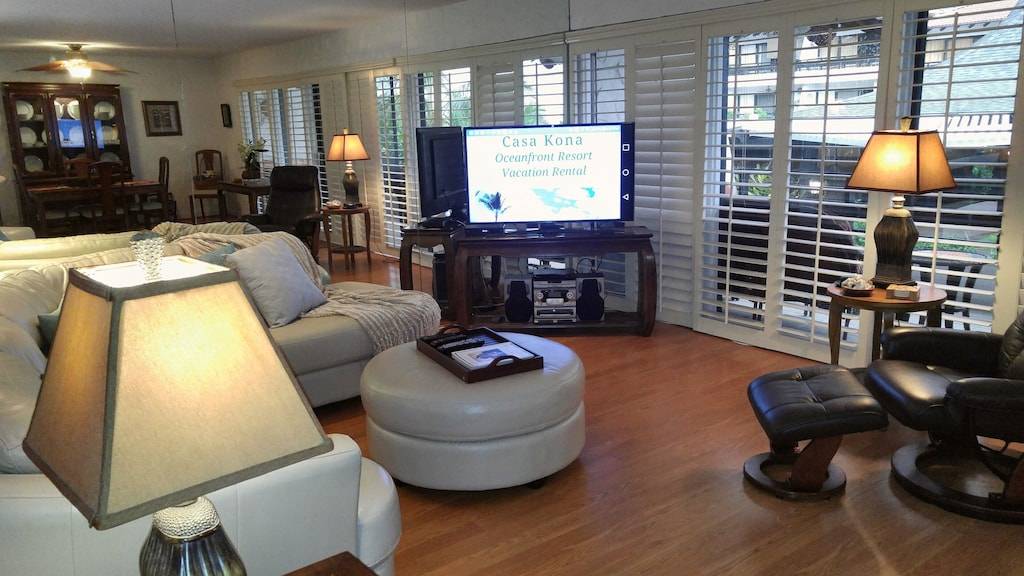 This condo is spacious (nearly 1300 square feet) and feels like a real home with its spectacular ocean views and central air conditioning! Don’t depend on tradewinds to keep you cool or settle for condos with window units in only one or two rooms. Casa de Emdeko is one of the few complexes in Kona with true central air conditioning. There is no additional charge for running the AC during your stay.