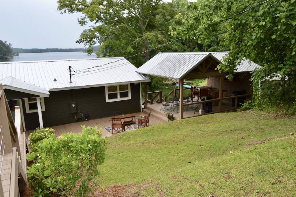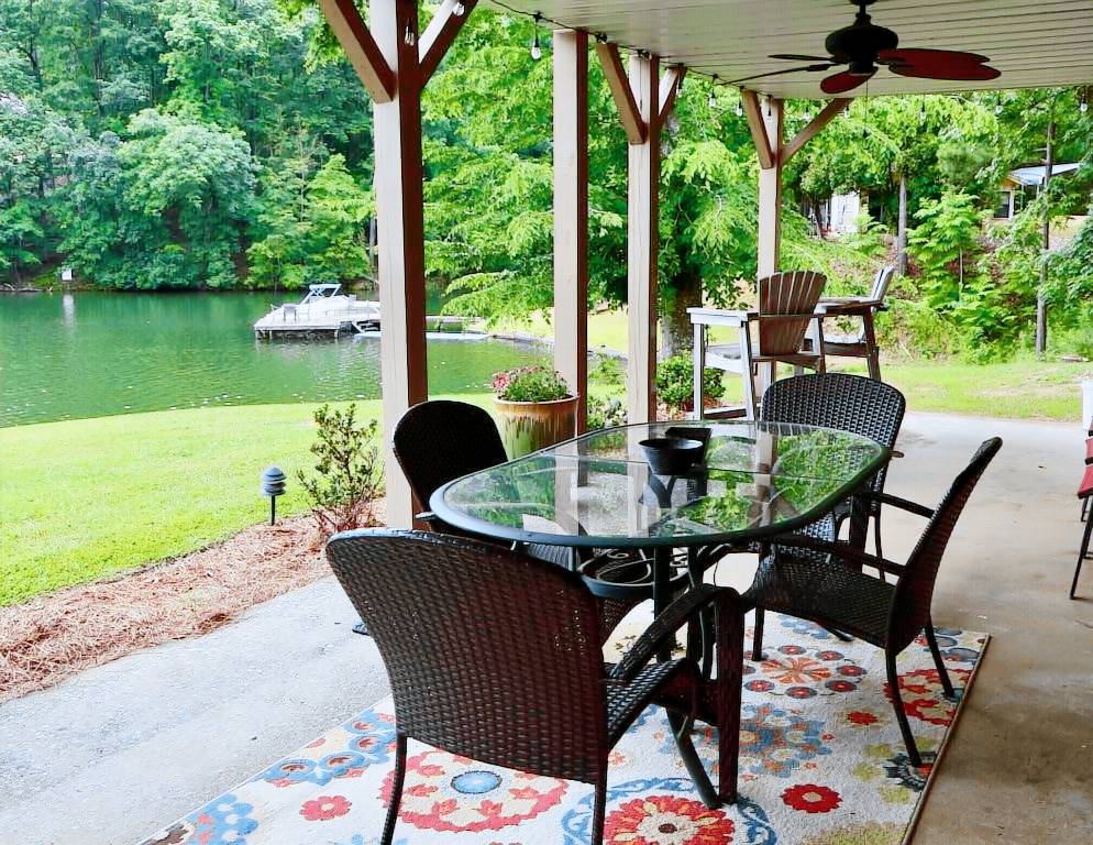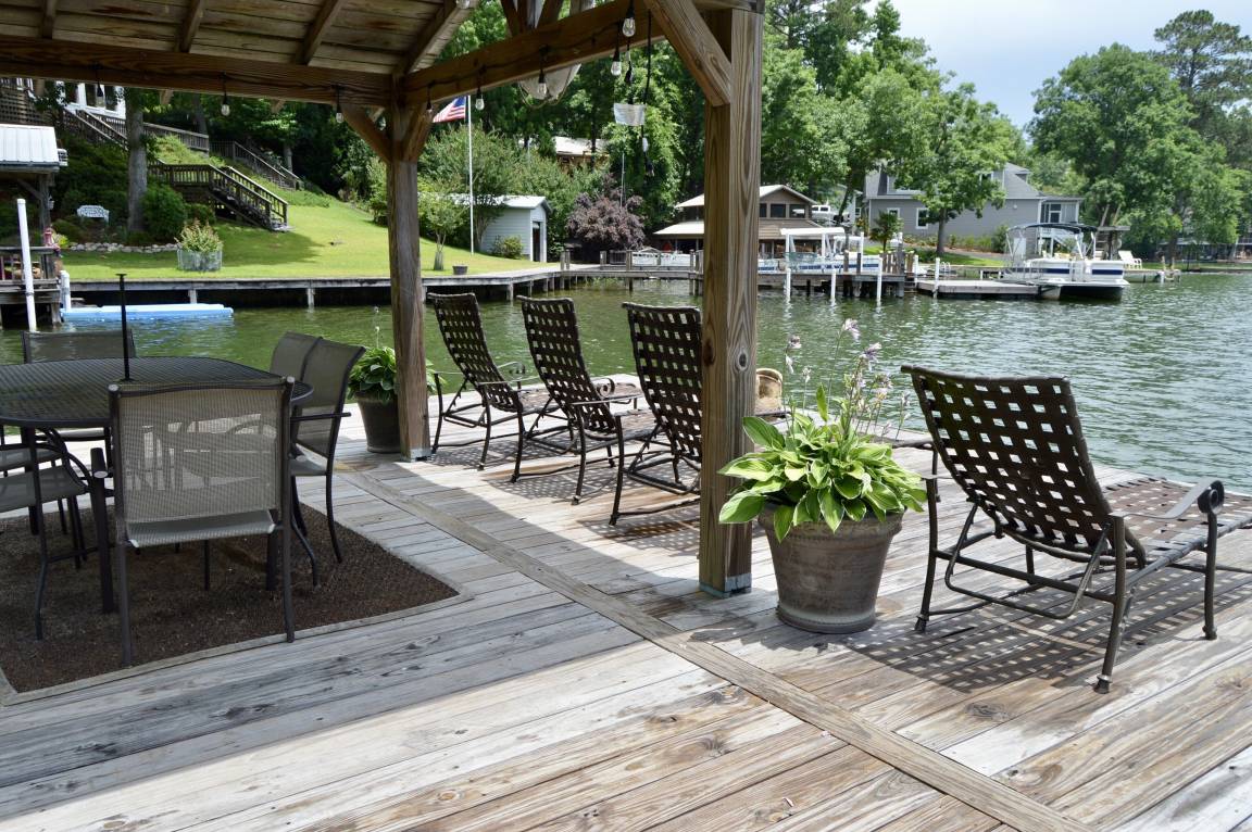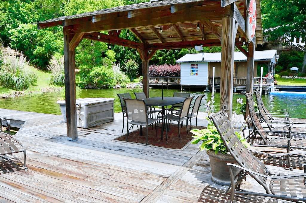 Down on the water follow the boardwalk to a large pier with gazebo outfitted with a table and chairs. When it’s hot, flip on the ceiling fan for an extra breeze! There’s also plenty of lounge chairs for relaxing in the sun. A floating dock is anchored next the big pier, perfect for the kids to jump and dive into the lake from! We have a float mat for your enjoyment tied to the pier.