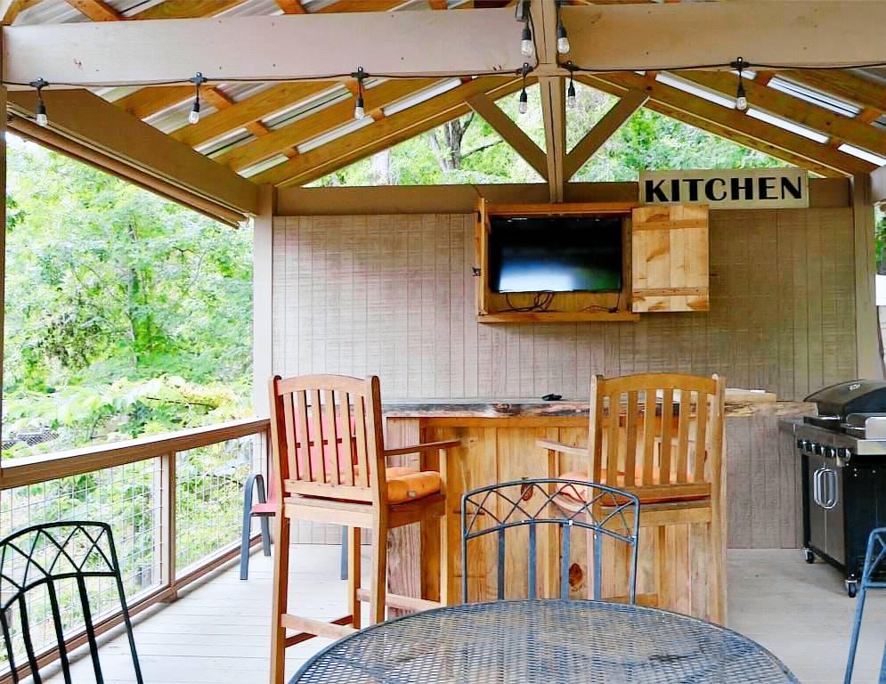 There is a covered patio downstairs when you want to get out of the sun. There is a large grilling area with a flatscreen smart tv equipped to watch YOU TUBE app tv, a bar & barstools with enough seating for all your guests while cooking on the gas grill. Please make arrangements to furnish your OWN PROPANE tank for the grill.