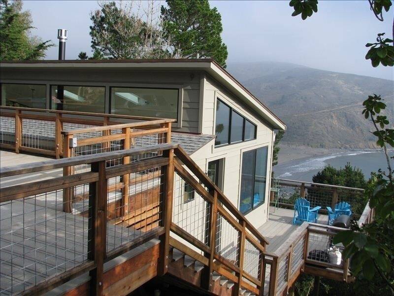 Very private coastal home nestled at treetop level yet with dramatic ocean views from every room. House was built and finished October 2010, so every thing about this house feels current. Light filled house with sky lights, soaring ceilings, floor to ceiling windows with unobstructed views of the Pacific Ocean, Headland Mountains, crashing waves and San Francisco beyond. Huge wrap around deck, private deck off master bedroom with Adirondacks and lounge chair for sunning, relaxing, watching the waves or nighttime stargazing. Hawks and falcons fly overhead as whales and dolphins pass by at various times of the year.