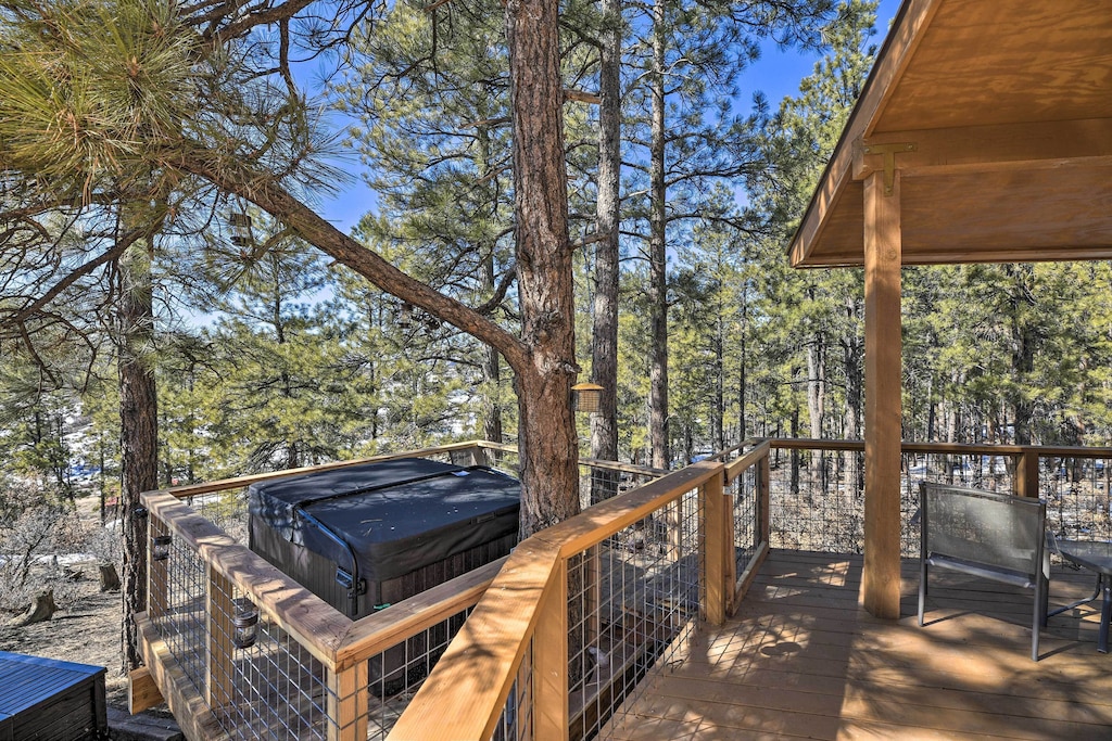 STEP OUTSIDE: Private wraparound deck w/ outdoor dining space, lighting, private hot tub, San Juan National Forest access on-site