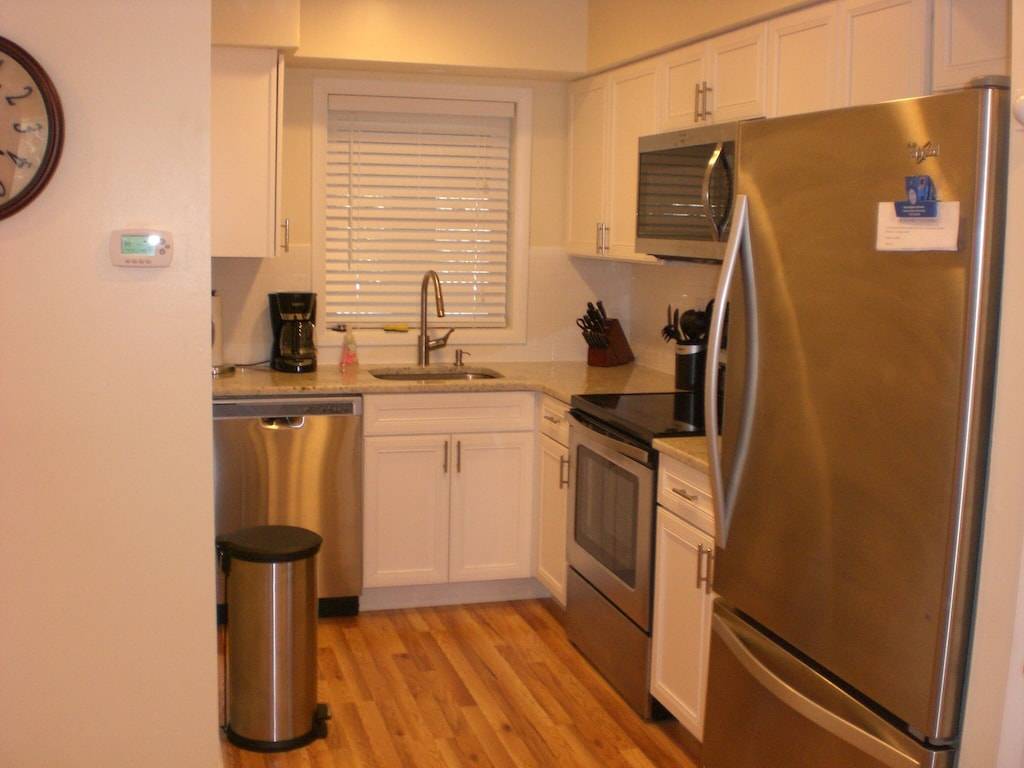 This two story property features many upgrades and recent total unit renovations such as new, floors, appliances, washer dryer, stone countertops, garbage disposal and more. It offers a large second floor balcony for sunning, and a semi-private gardened patio for relaxing and grilling. Tastefully furnished in a natural motif. Two bedrooms (with ceiling fans) and each with its own bathroom, one with a king-size bed and one with two twins that can be pushed together to make a second king. Half bath downstairs. Exterior building has had a complete exterior makeover! Looks brand new! High-speed Wi-Fi! Flat Screen TV, cable and DVD player in each bedroom and the den (one with Blu-ray).