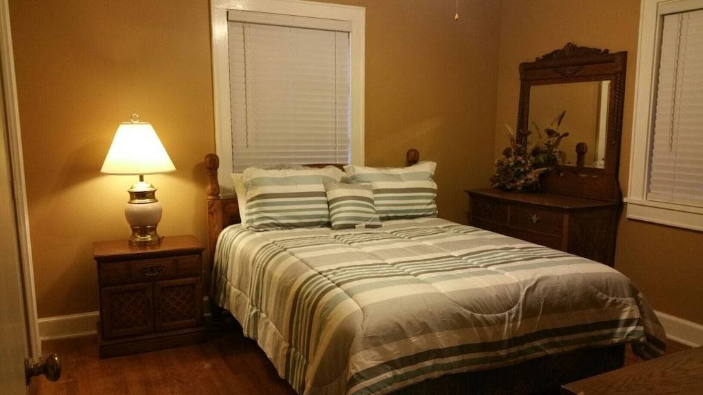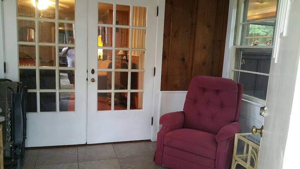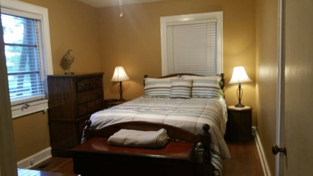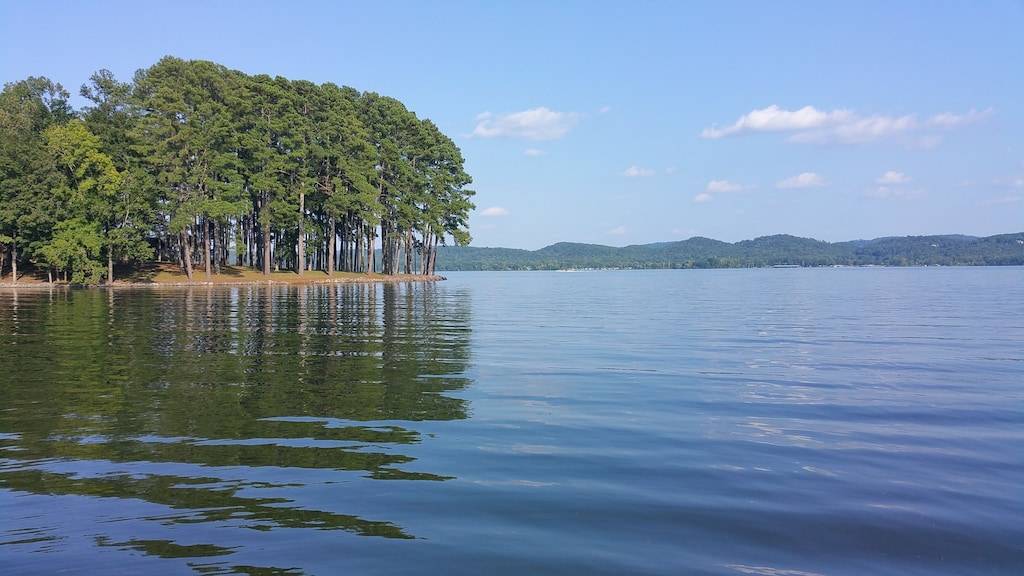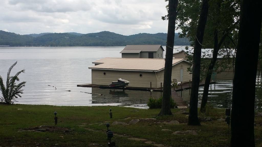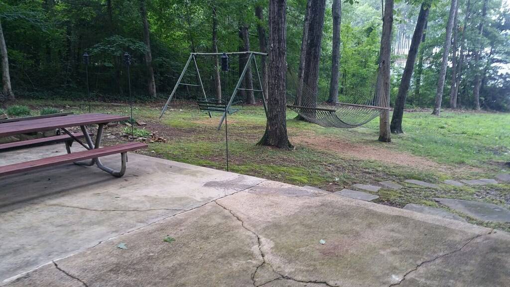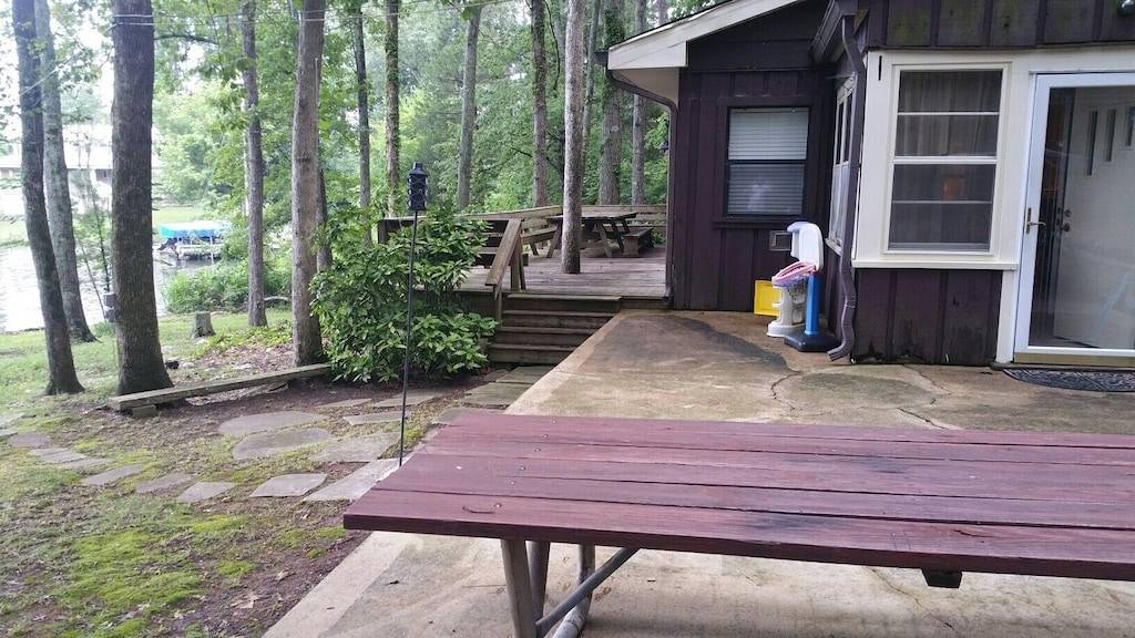 Large wooden deck with built-in seating and 15 foot long picnic table. Adjoining patio has charcoal grill, picnic table and covered swing. We are at the center of a quiet bay which opens into the main channel of Guntersville Lake. Easy access to nearby public launches on either side of property 2 miles away including Waterfront Grocery and Launch 2 miles down the street. We are located off Highway 79 between Guntersville and Scottsboro.