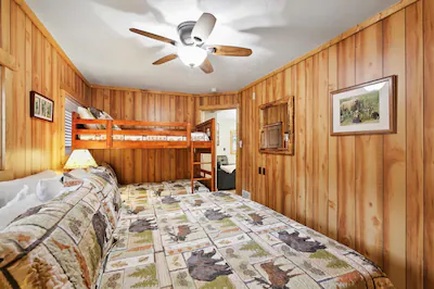 The ‘Bears by the River’ Master bedroom has original log siding, a sliding glass door to the river (less than 15′ away), an ensuite bathroom with shower, a walk-in closet, a King bed and TV.