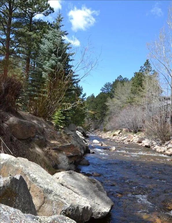 Our ‘JVRSpa River Cabin’ is on 450′ of the beautiful Fall River. Riverfront Hot Tub, Mountain Views, Fish in the River, Lounge on Patio, Steam Shower, Wildlife – Moose, Elk, Fox, Coyote, Wild Turkeys, Bears & Big Horn Sheep have been seen at our home. 2 miles to Rocky Mountain National Park & downtown Estes. Bike path into Rocky Mountain National Park just across the road.
