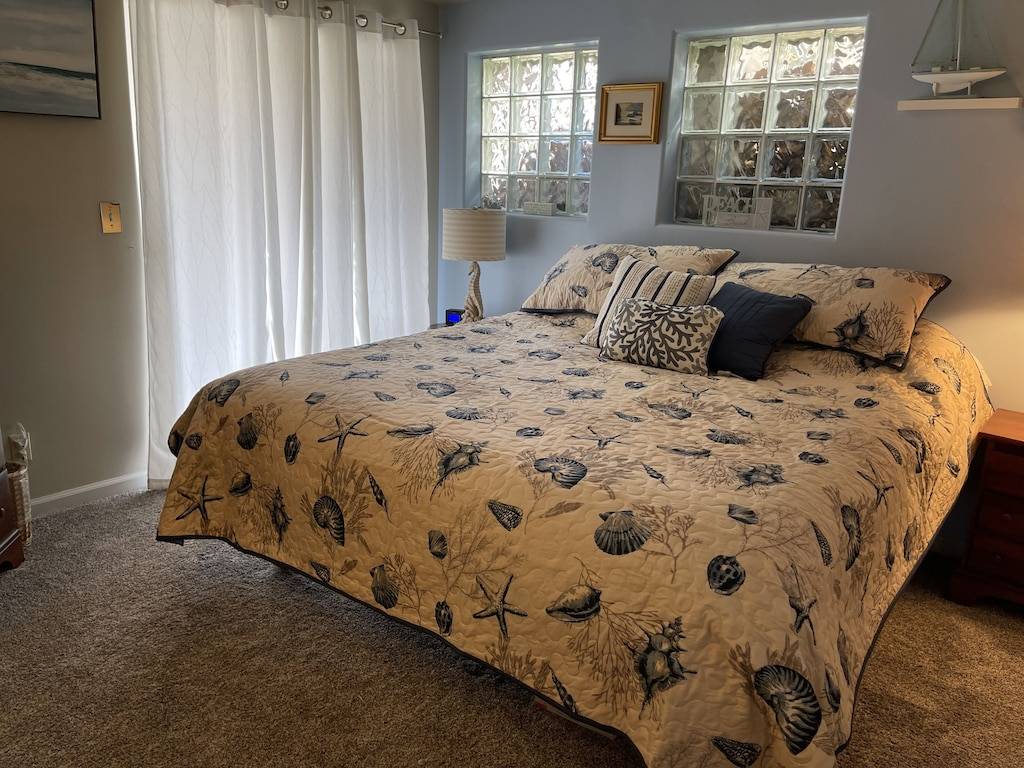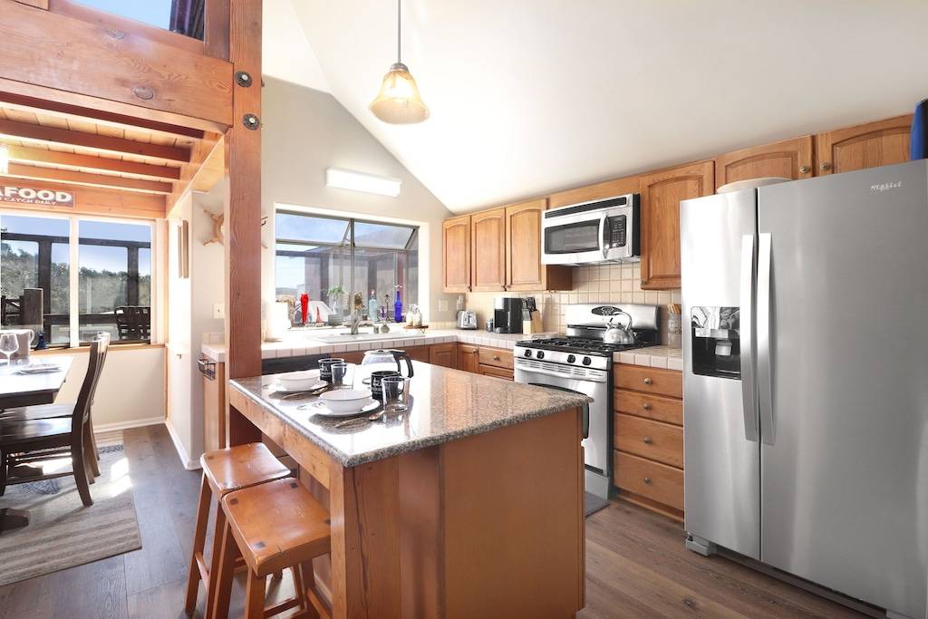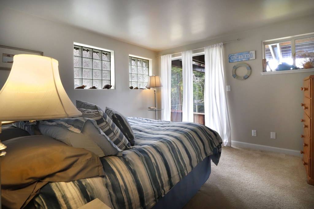 The two bedrooms and bath are located on the bottom floor. Both bedrooms have sliders out to the back yard. This comfortable home offers, Wi-Fi television, movies, and games