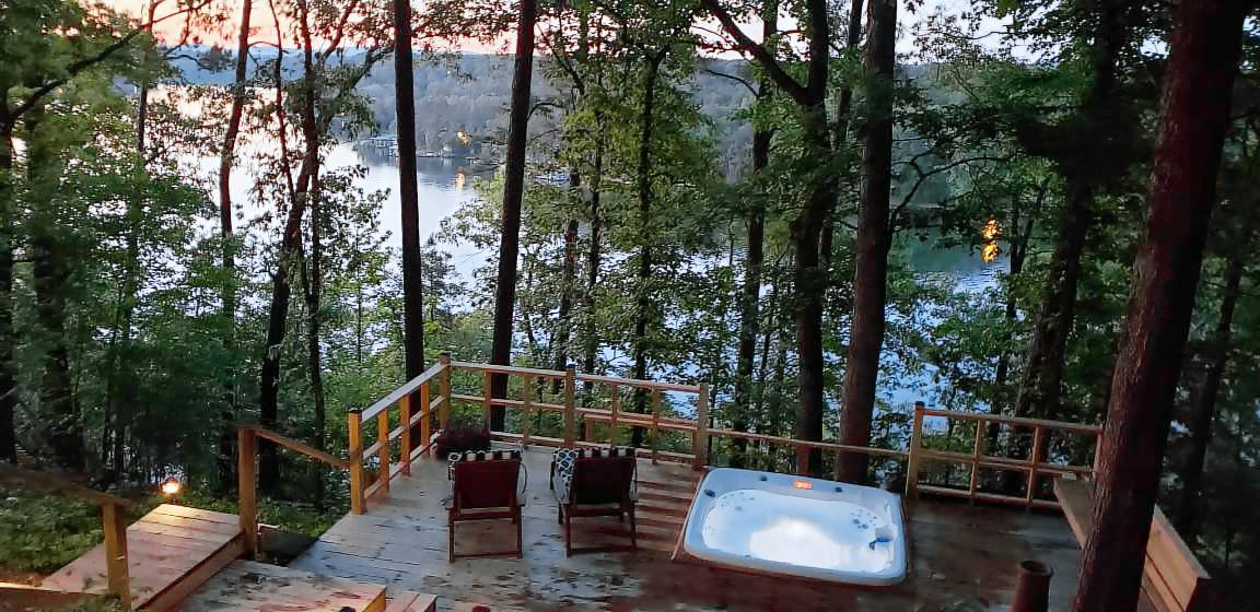 The property is on a steep slope with wooden stairs leading down to the lake. There are several landings along the way to make the walk as enjoyable as possible, however, the walk is not advised for young children or the elderly. Located off Timberlake Road between highways 70w and 270w, approximately 12 minutes from Lake Hamilton School. Perfect for small families, a romantic getaway, or even a girl’s weekend. If you’re looking for ultimate privacy, beautiful scenery and wildlife with acreage on Lake Hamilton, this is your place!