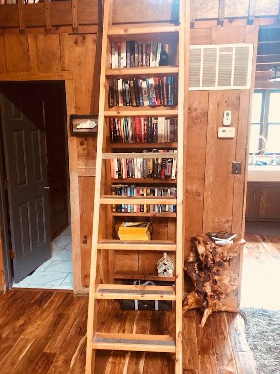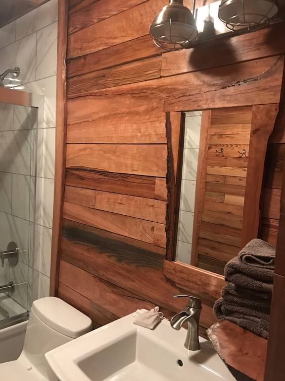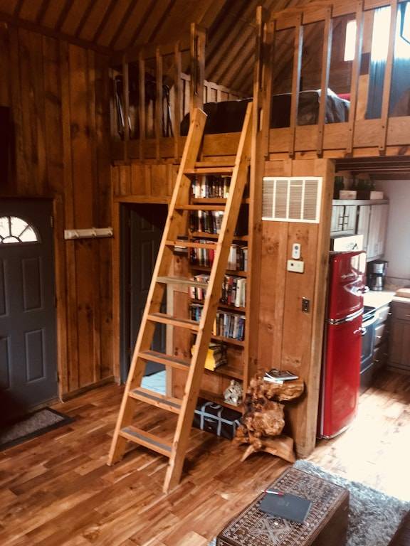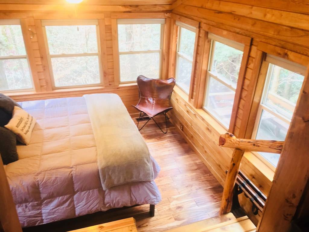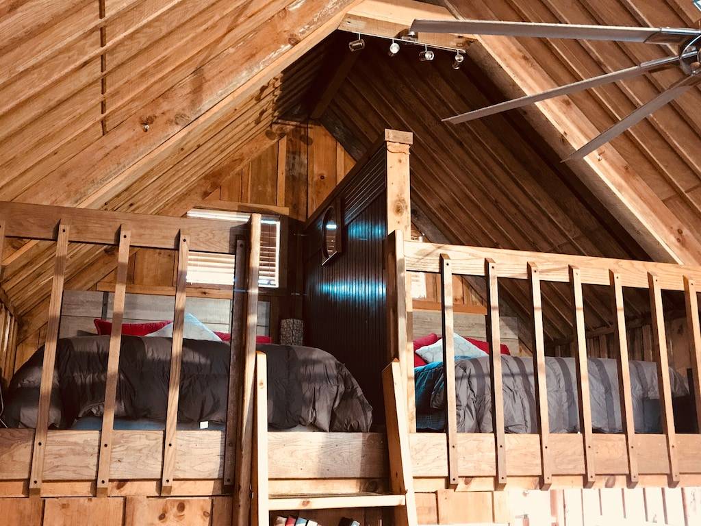 The cabin has 3 beds. One private master bedroom with a California King bed with a large hand made barn door. There is a loft containing two Queen beds divided by a wall. There is a nice sized couch for sleeping and extra comforters, blankets and pillows. The bathroom walls are made of 100 year old barn wood.