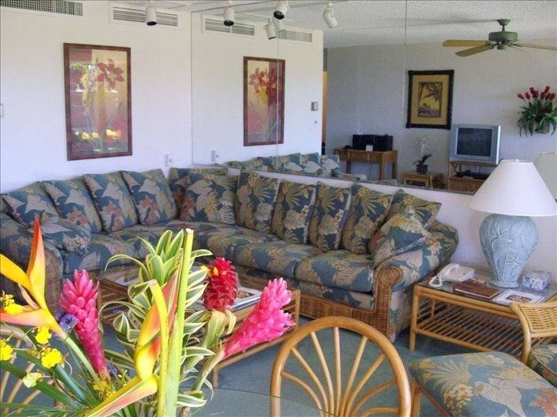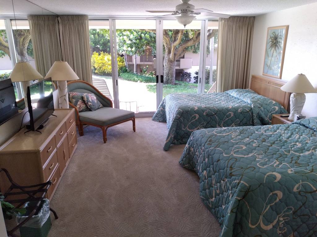 Our ground floor condominium is 50 feet from a lovely mosaic tile Green Sea Turtle pool that is a perfect, semi-private place for kids and families to cool off at the end of a day of sightseeing or island activities. Our lanai has comfortable chaise lounge seating and an outdoor dining set. It also has its own state-of-the art electric grill so that you never have to leave the unit to barbecue. The unit is a spacious 1,100 square foot, ground floor 1 bedroom, two full bath unit. It has two queen beds in the master bedroom and one high quality queen sofa sleeper in the living room.