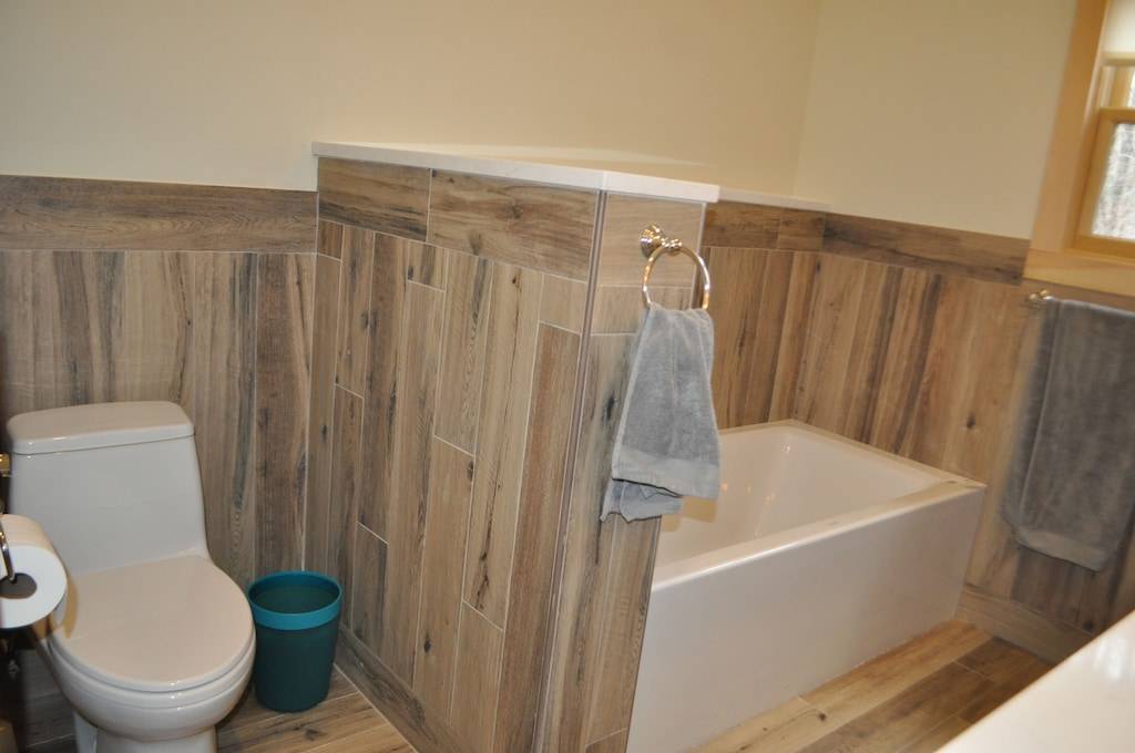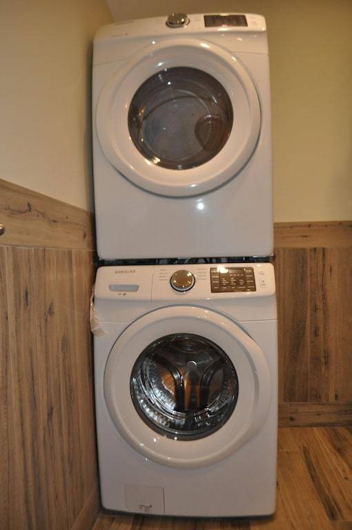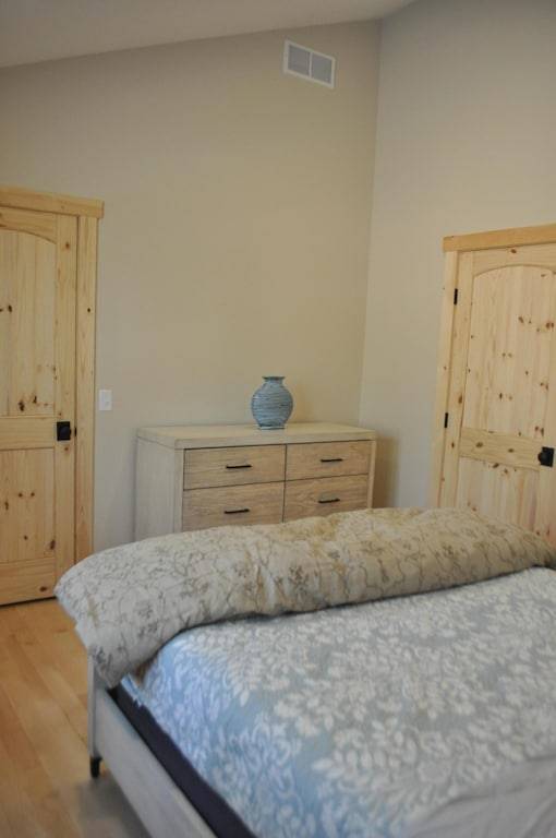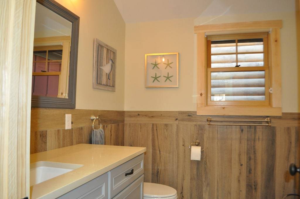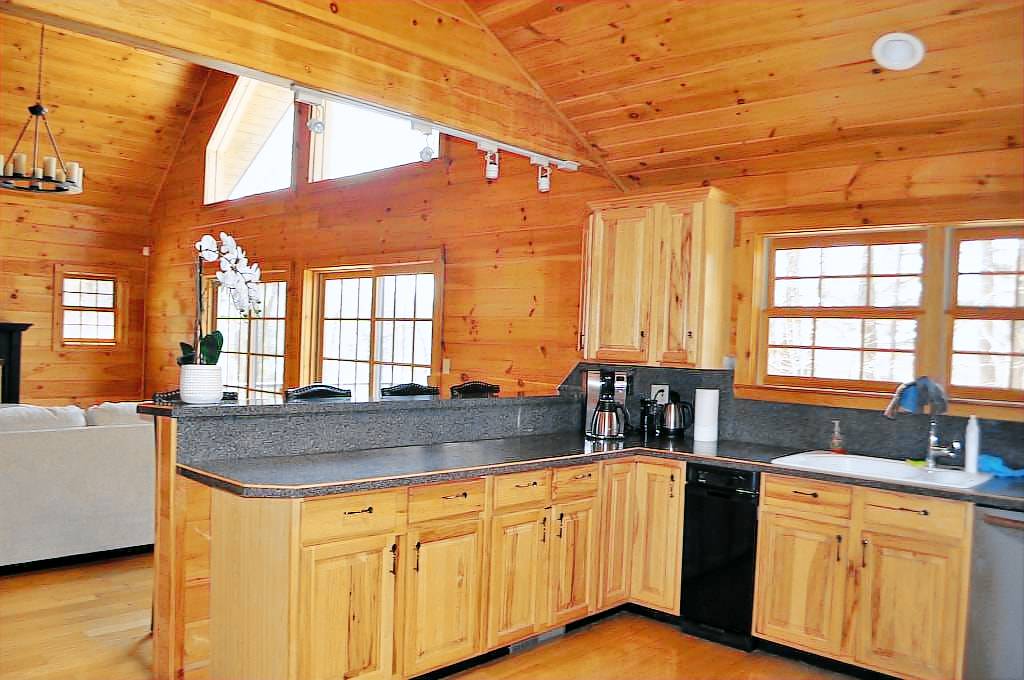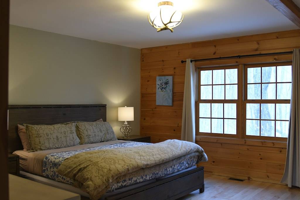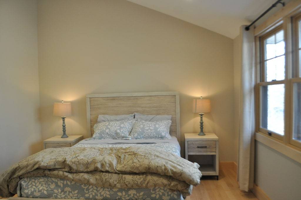 The lakeside house is built on a 1.1 acre lot with view of Lake Garfield. It is only three minute walk to the public beach with life guards on site. This one-level modern home has vaulted ceilings throughout. There are two master suites with king beds and two other bedrooms with queen beds. A walk out deck from one of the master bedrooms so you can enjoy morning coffee. Three common spaces include a loft for guests to chill out. A new washer and dryer is in one of the guest bathrooms. The kitchen with new stainless steel appliances is equipped with premium cooking tools and pots. Guests can hang out at the kitchen counter bar stools while someone is preparing meals. A gas grill is available on the front deck which can be accessed from the kitchen or the great room. There are two gas fireplaces to keep you cozy at night time.