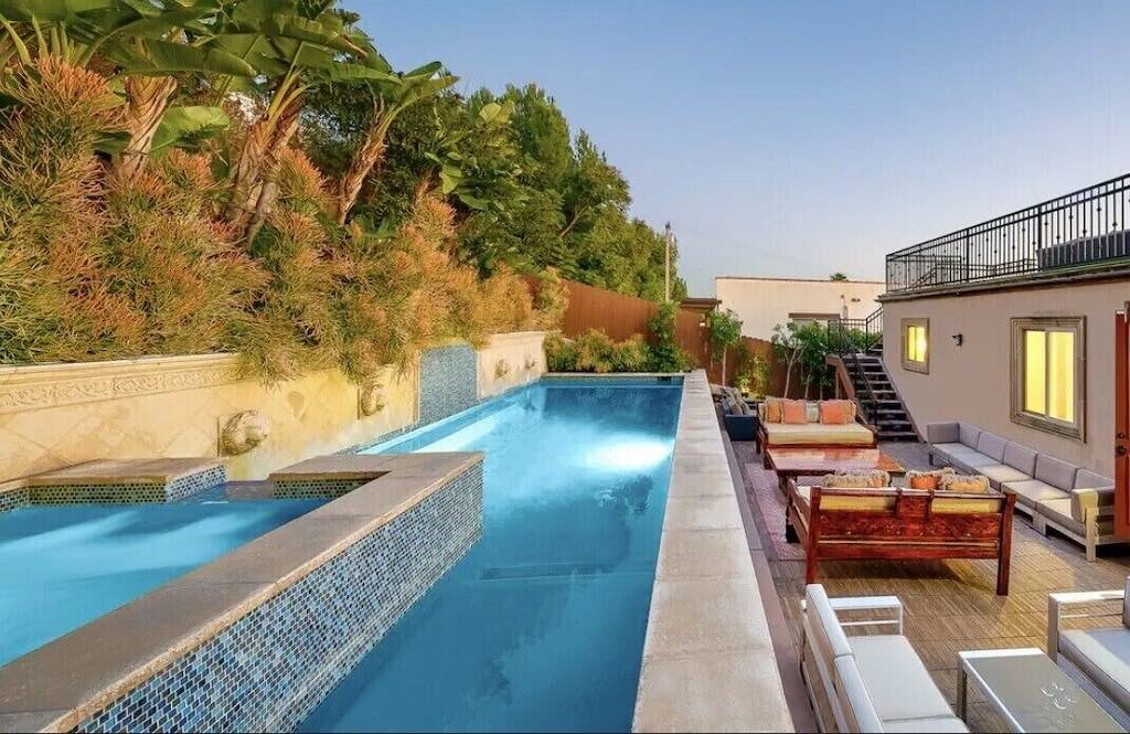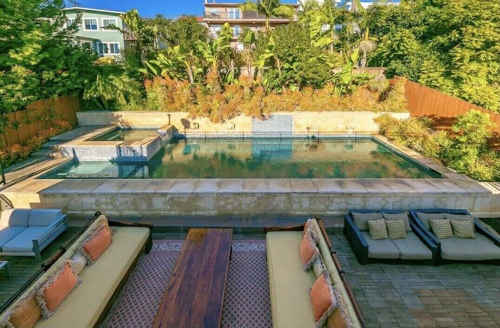The backyard features an elegant pool and jacuzzi with chaise lounge chairs and ample seating for outdoor entertaining and eating.
