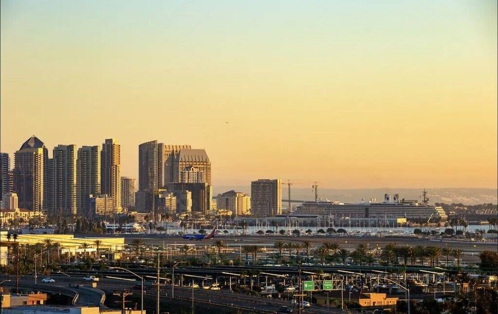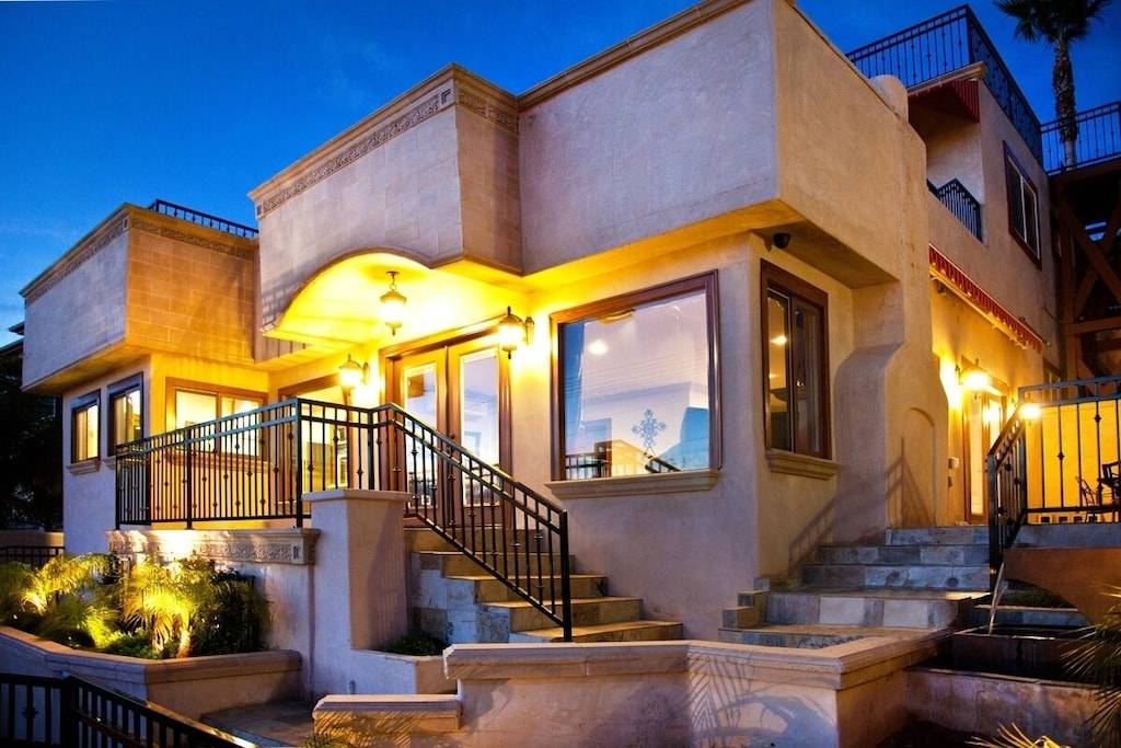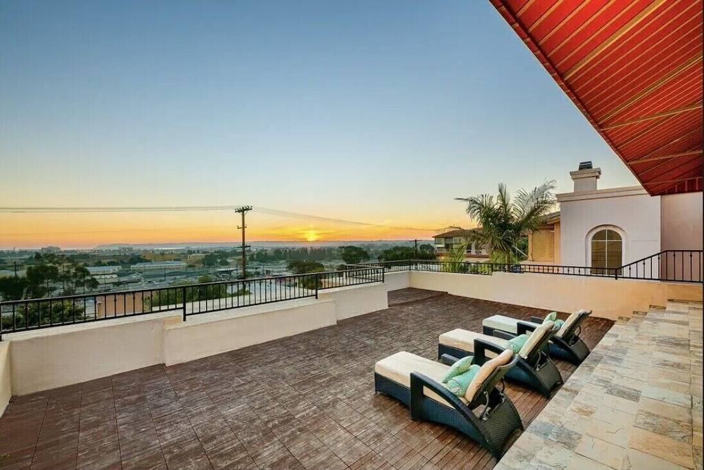 From the west facing rooftop deck with outdoor living room furniture, enjoy a cocktail as you watch the planes fly into San Diego International Airport, enjoy the sunset over San Diego Bay, or watch the Sea World fireworks after dark. This house has panoramic views of the Downtown skyline, city lights, San Diego Bay and Pacific Ocean.