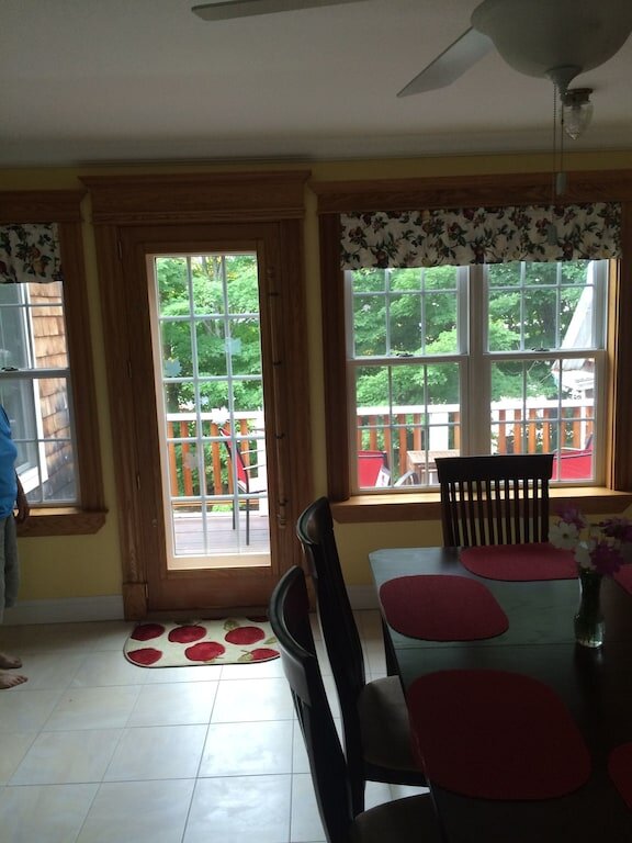 Lovely newly renovated private two bedroom apartment with large kitchen and deck off the kitchen. Queen size bedroom and two twin beds. Walking distance from eating establishments, town park, swimming, boating and paddling. There is Ice skating, (free skate rentals across the street) and snow shoeing in winter. Kayaks and paddle boards can be rented by the hour at Haley Pond, as well as snow shoes in the winter. All either across the street or within a very short distance from your accommodations. Haley Pond is across from my house and all you do is CROSS THE POND TO ACCESS SNOWMOBILE TRAILS . The driveway will accommodate two trailers. The village is a fun place. IN SEASON: 2 NIGHT MINIMUM ON SNOWDEO WEEKEND THE BASE PRICE IS FOR 2 PEOPLE. There is an additional price of $15. per night for each additional person up to 4 guests. DO NOT exceed the number of guest you have booked, they will not be allowed to stay. A small well-behaved dog (12pounds) is okay. Just don’t leave it alone in the apartment. Less